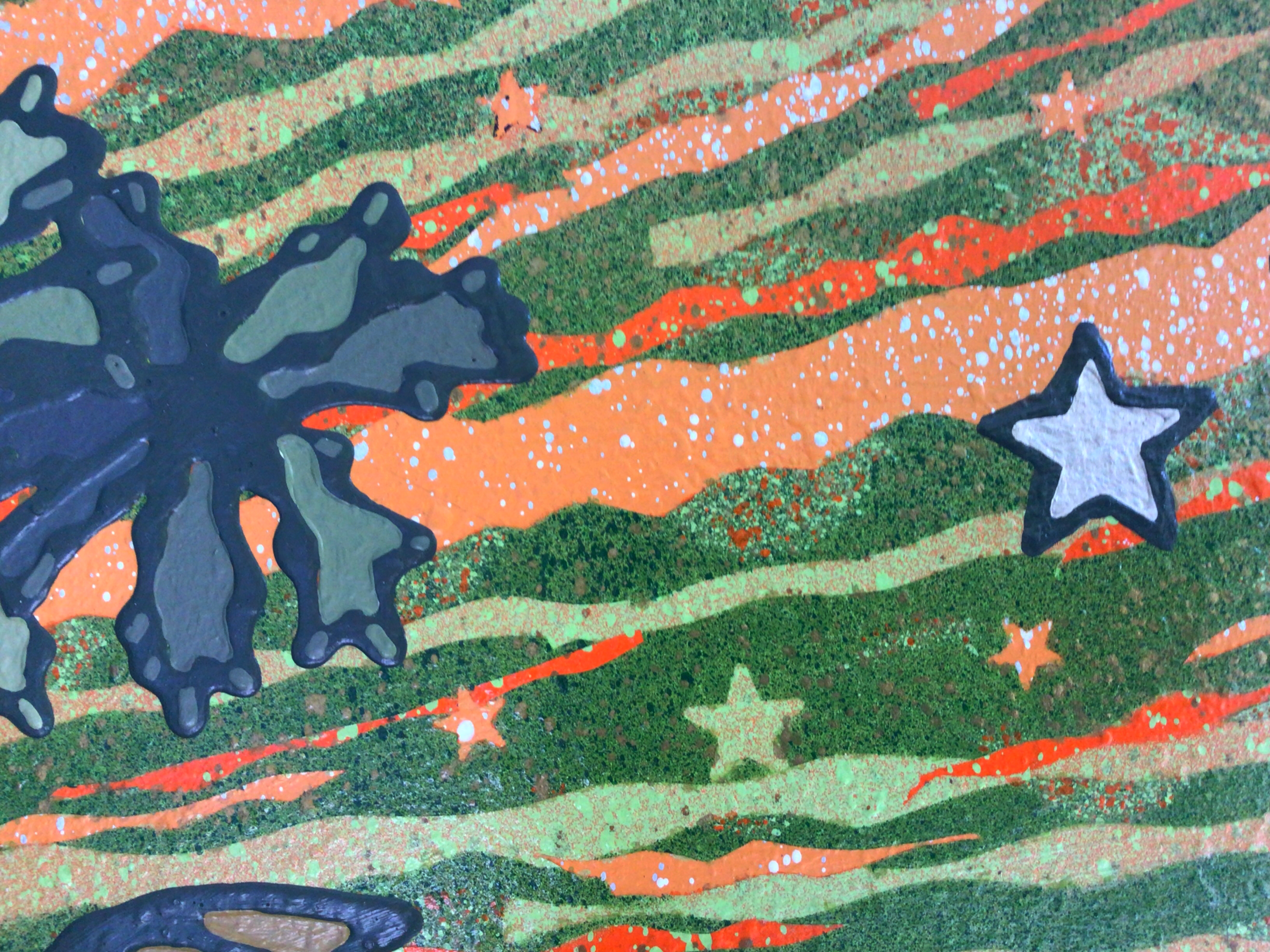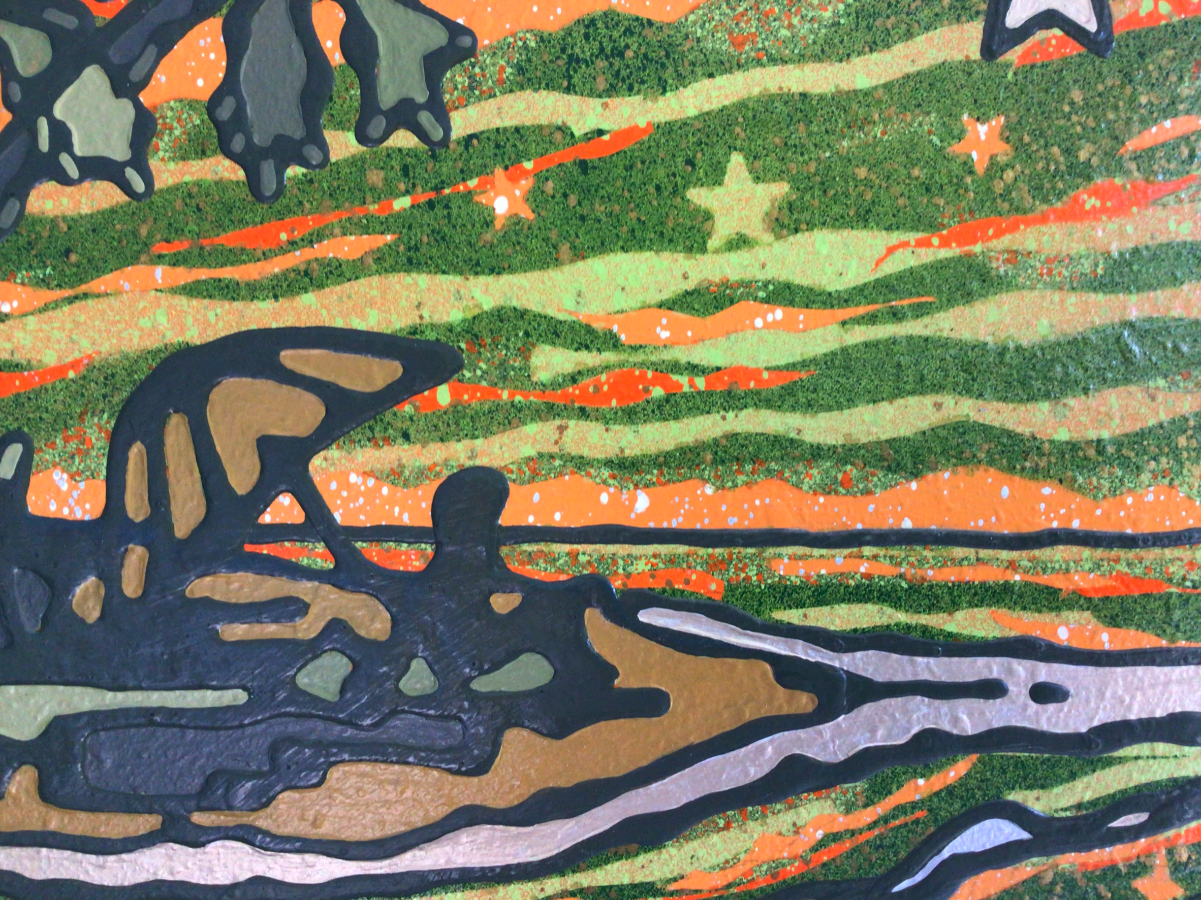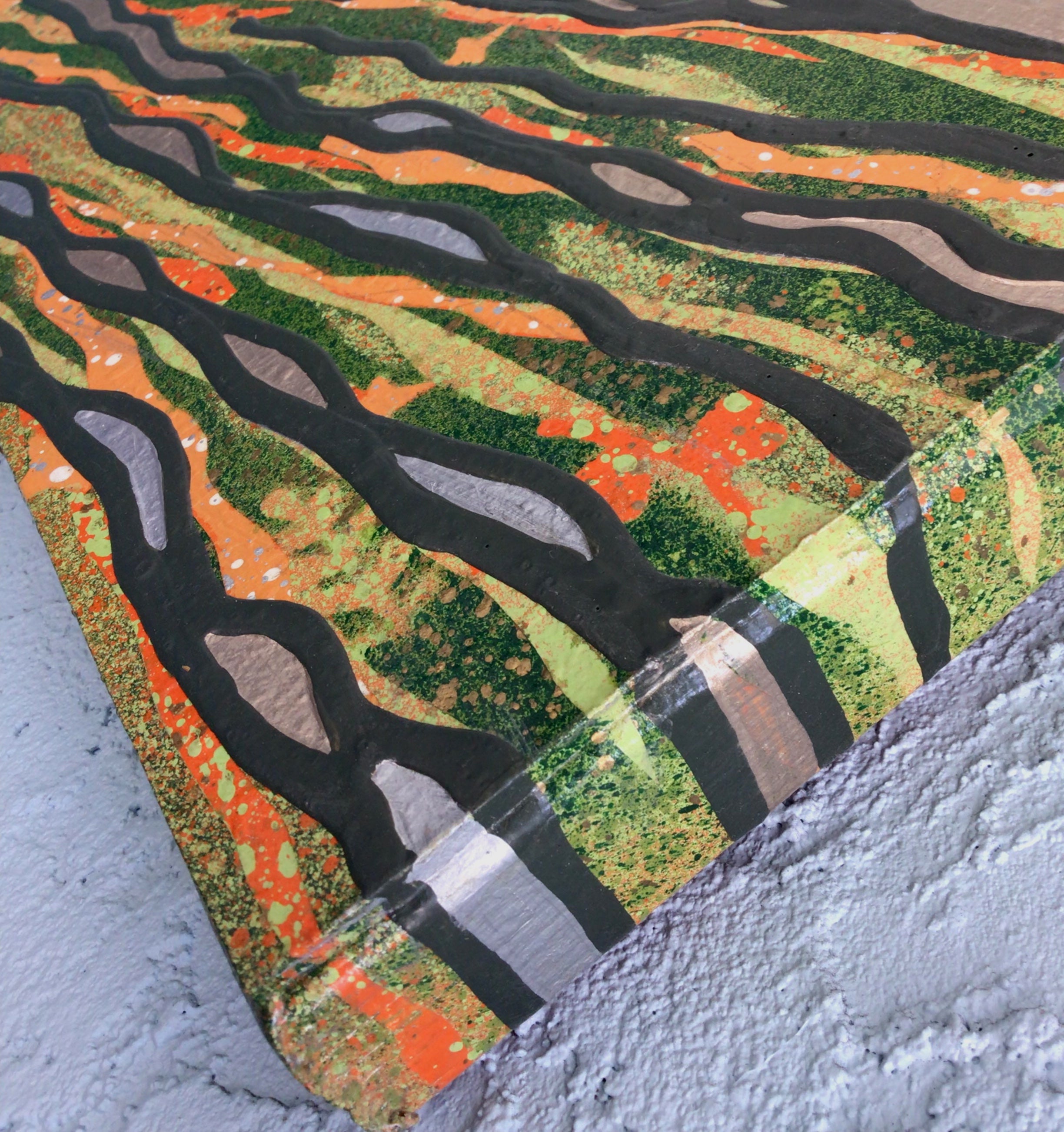 A 'hybrid' painting demonstrating a merger of the styles from 'A Stream of Discovery' and 'A Scattered Resonance" Acrylic and enamel on a studio made cradled wood frame that is ready to hang.