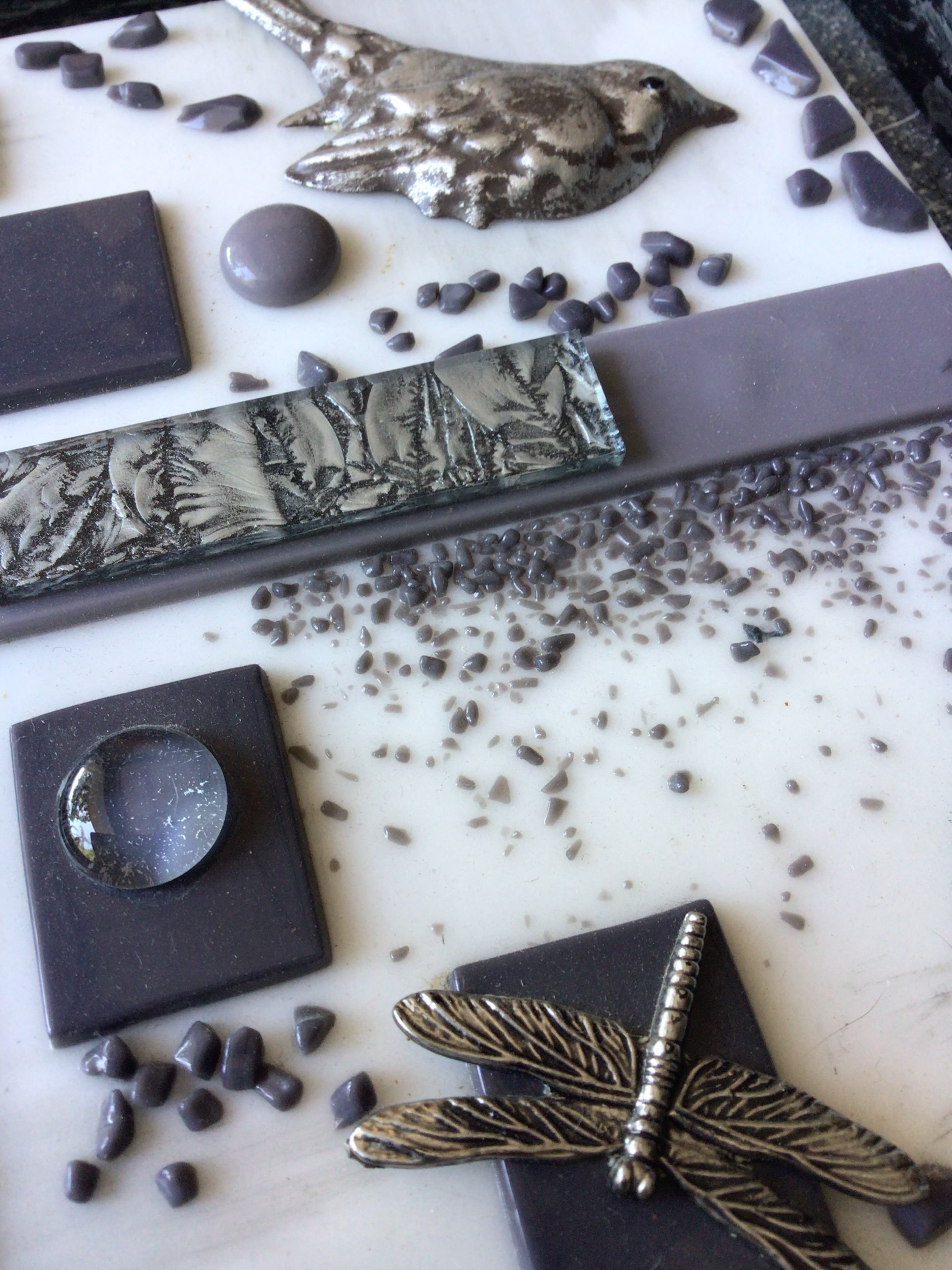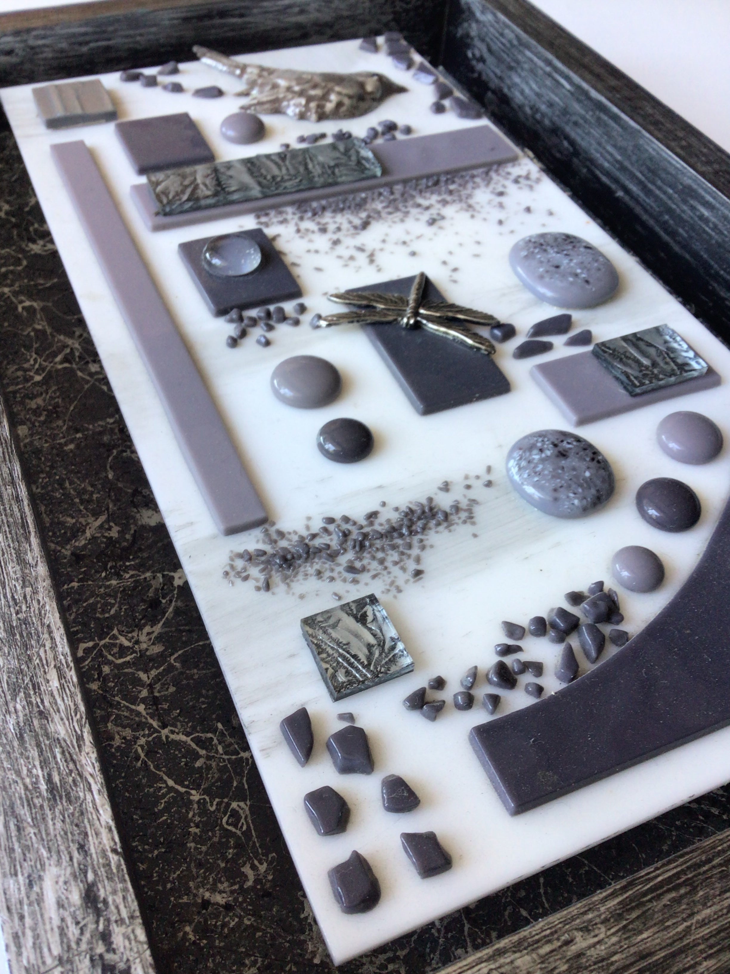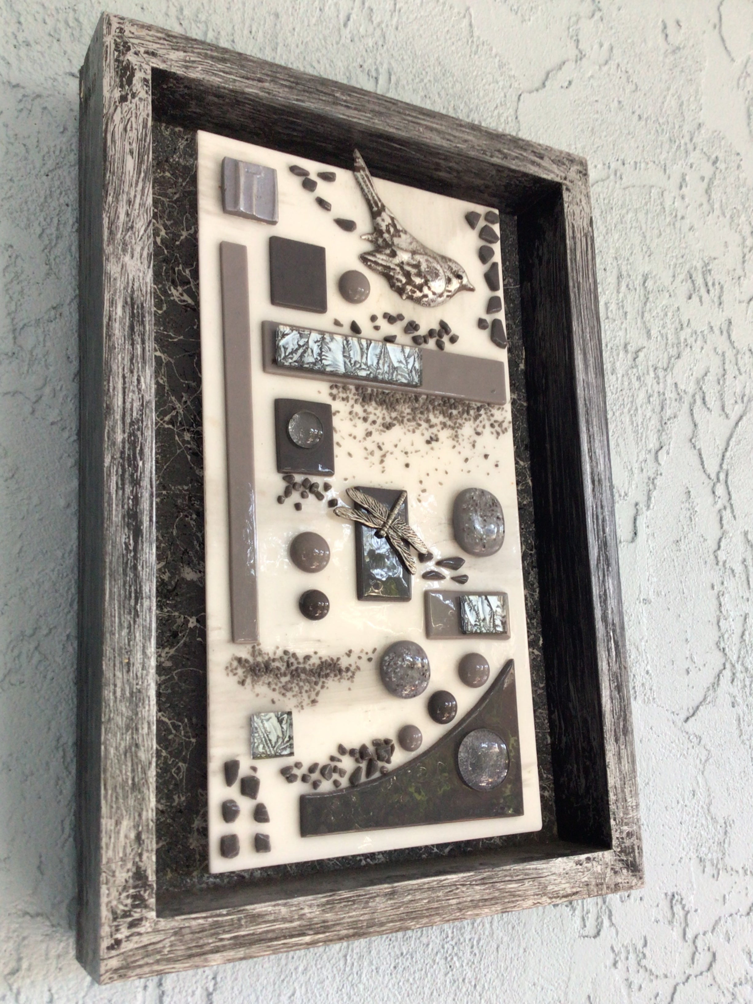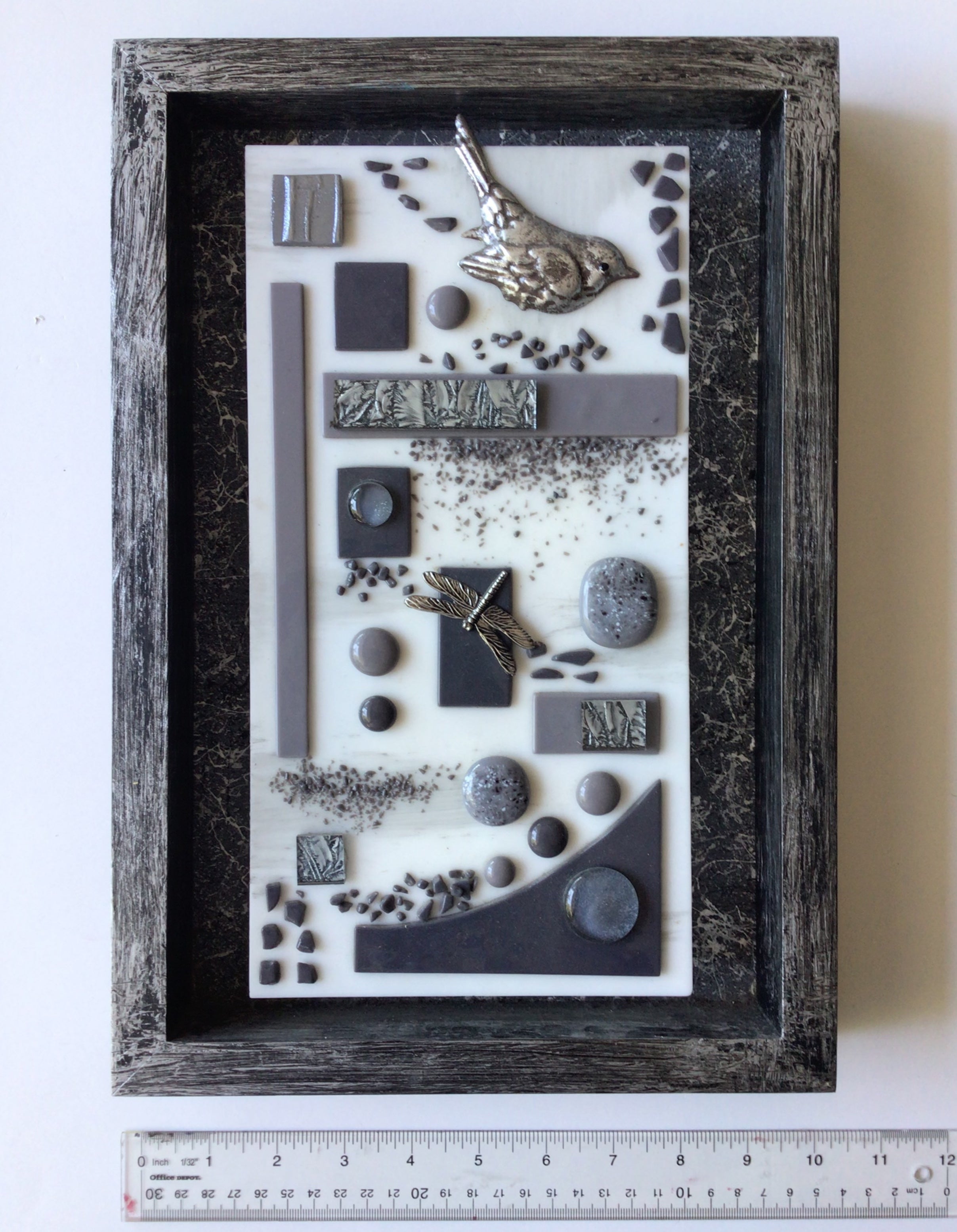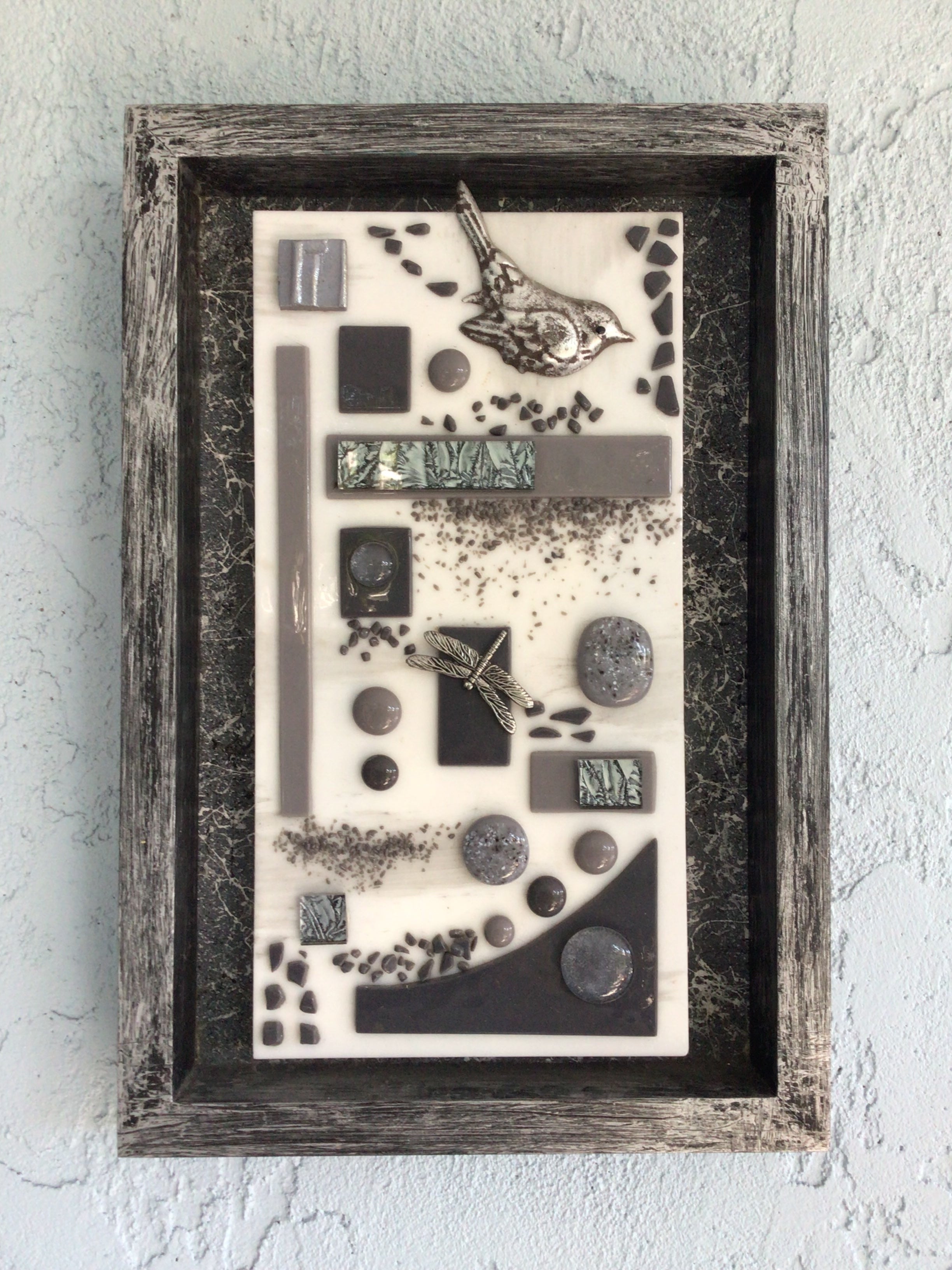 "The Magic of Being Still" - 9.75" x 14.5" Original mixed media fused glass with metal elements on an abstract painted wood panel in a studio made frame by artist Helen Geremia.
