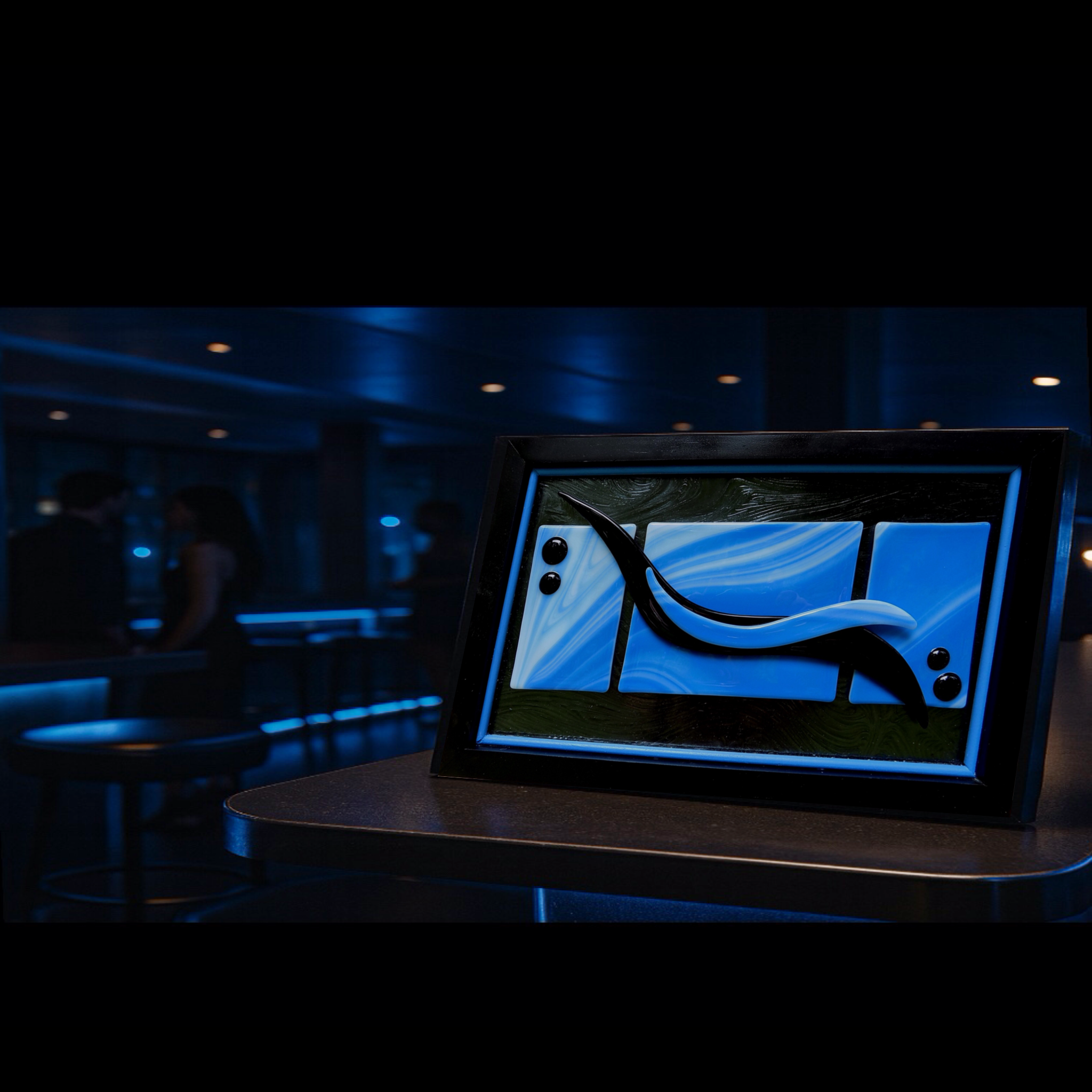"Wicked Game" - 15" x 9" Original mixed media fused glass on an abstract painted wood panel in a studio made frame by artist Helen Geremia.