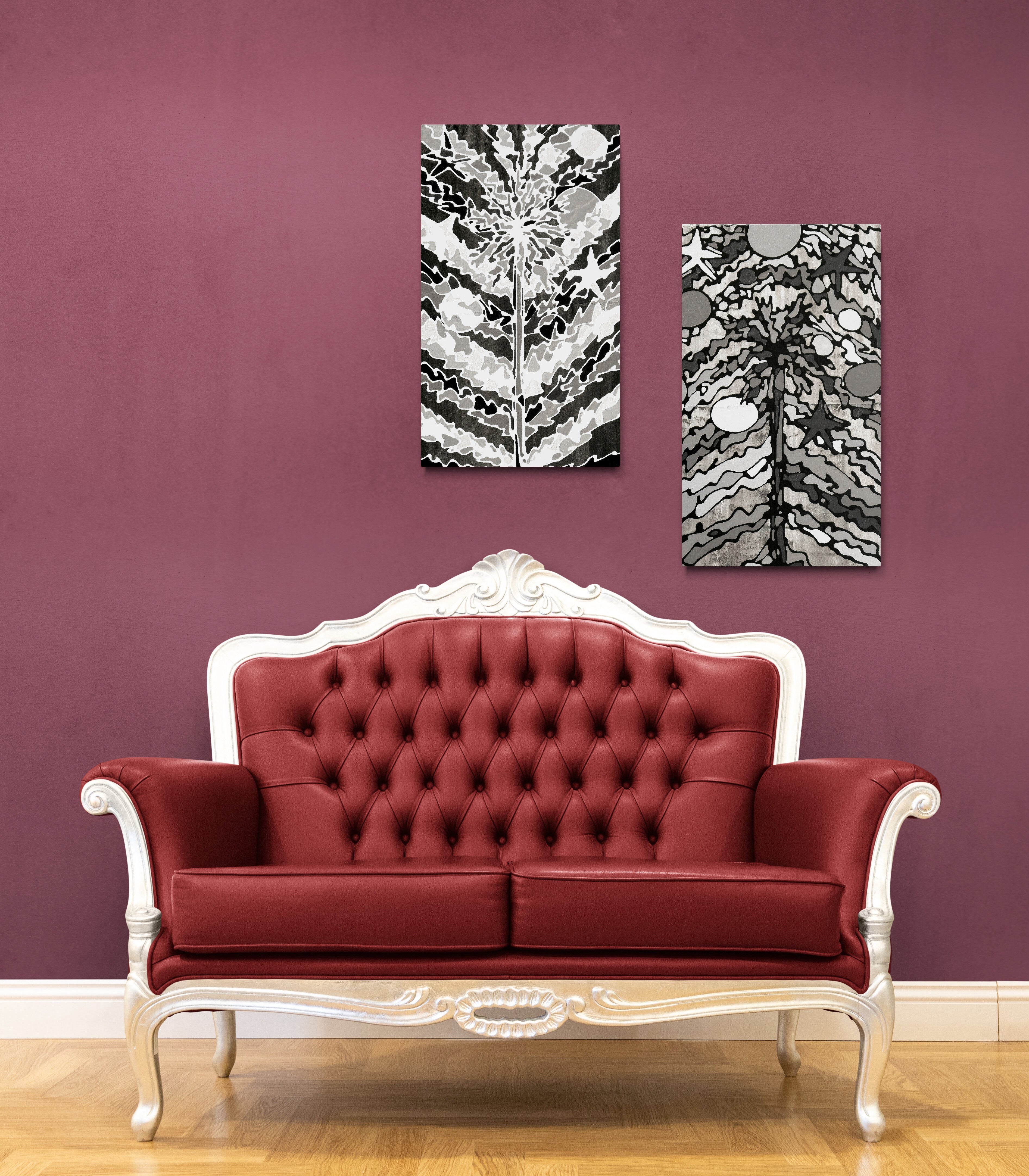 Paintings are acrylic on fabric covered, hand made, cradled wood frame and the paintings are continued on the sides.  Each painting measures 18" x 30" x 3". The paintings are further protected by a coat of matte varnish.