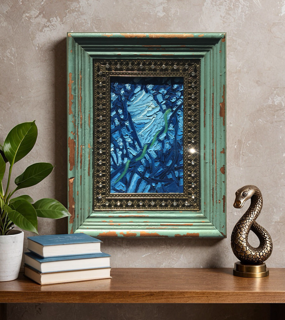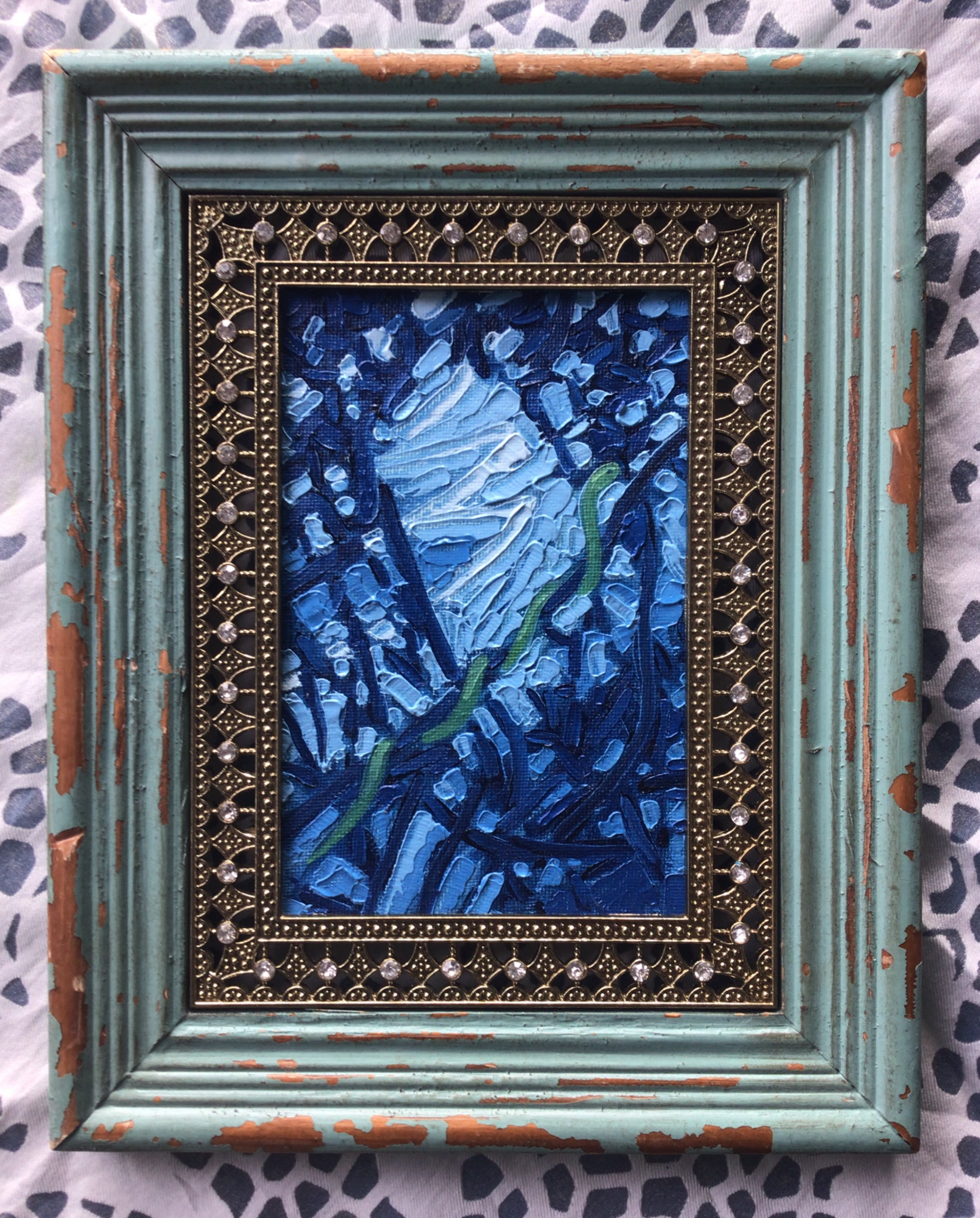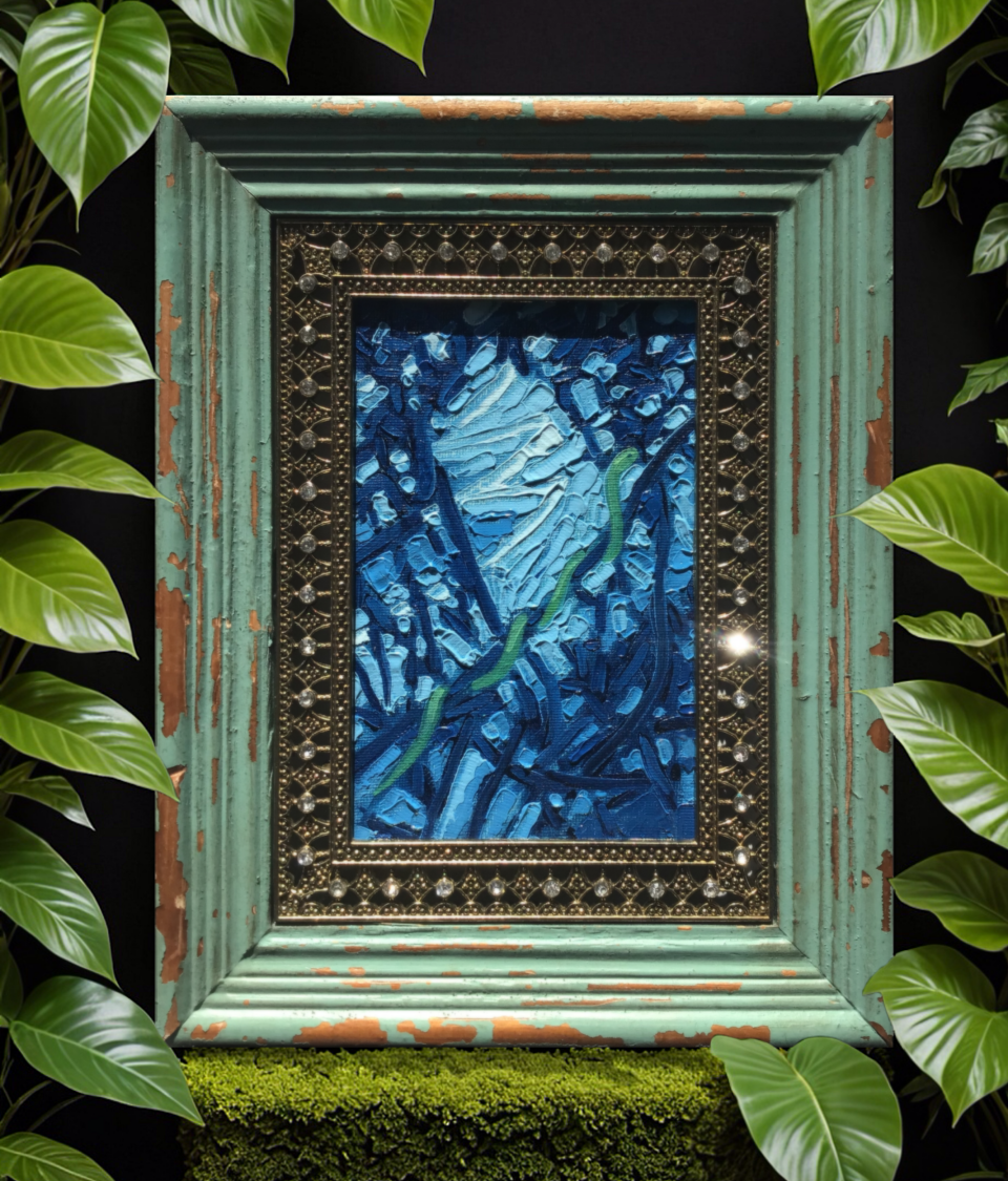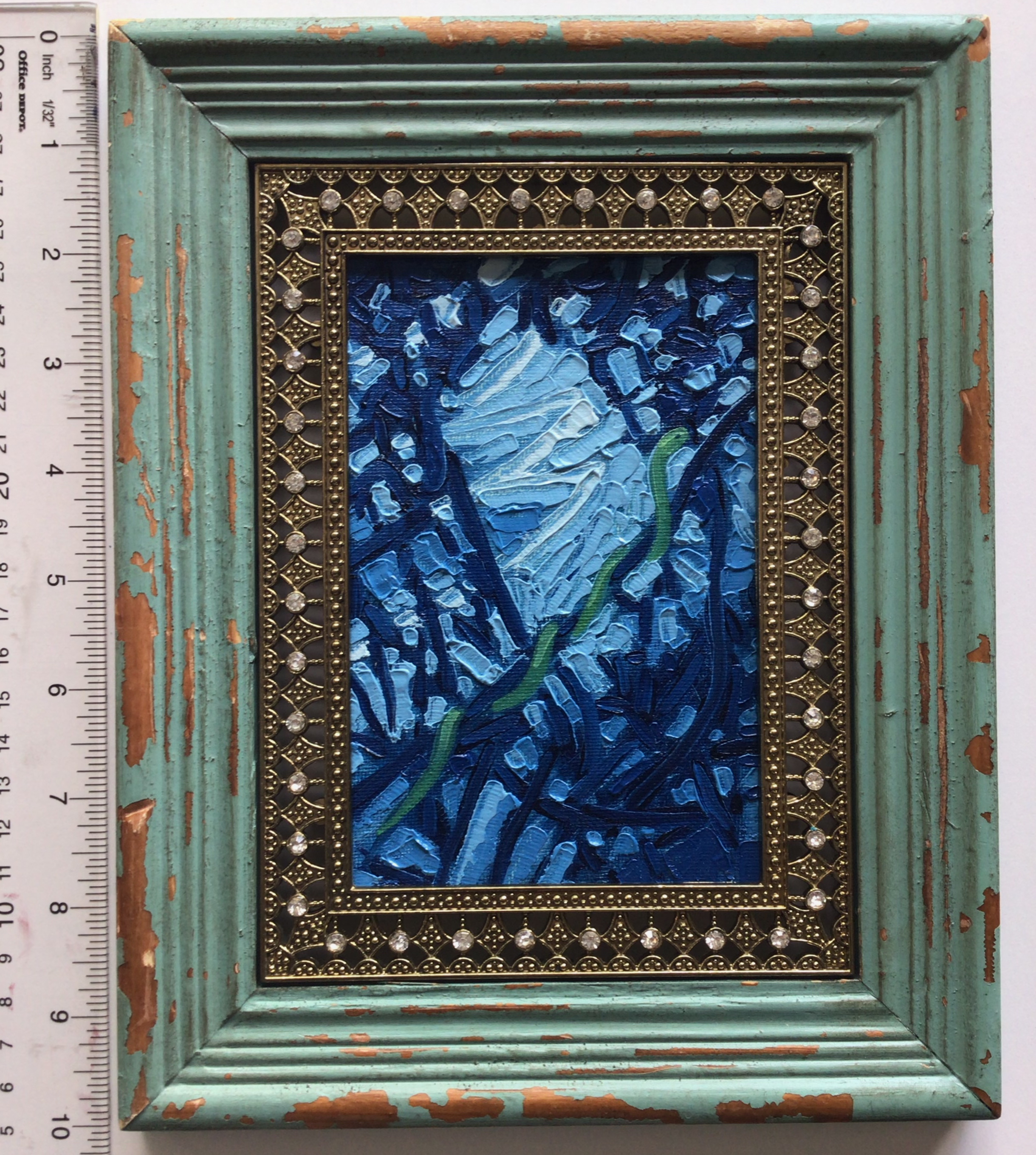 "An Agitant in the Garden" Original 7.75" x 9.85" (framed dimension) fine art oil on  canvas panel in a 'distressed' look hand painted natural wood frame that is ready to hang.