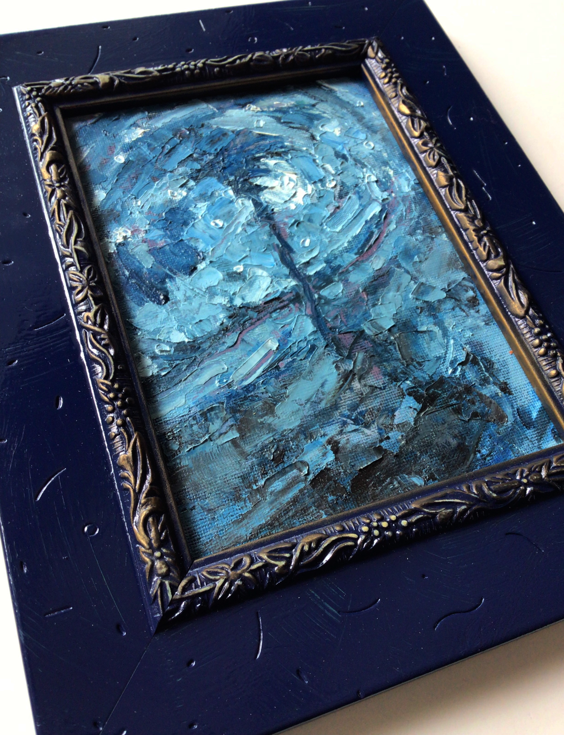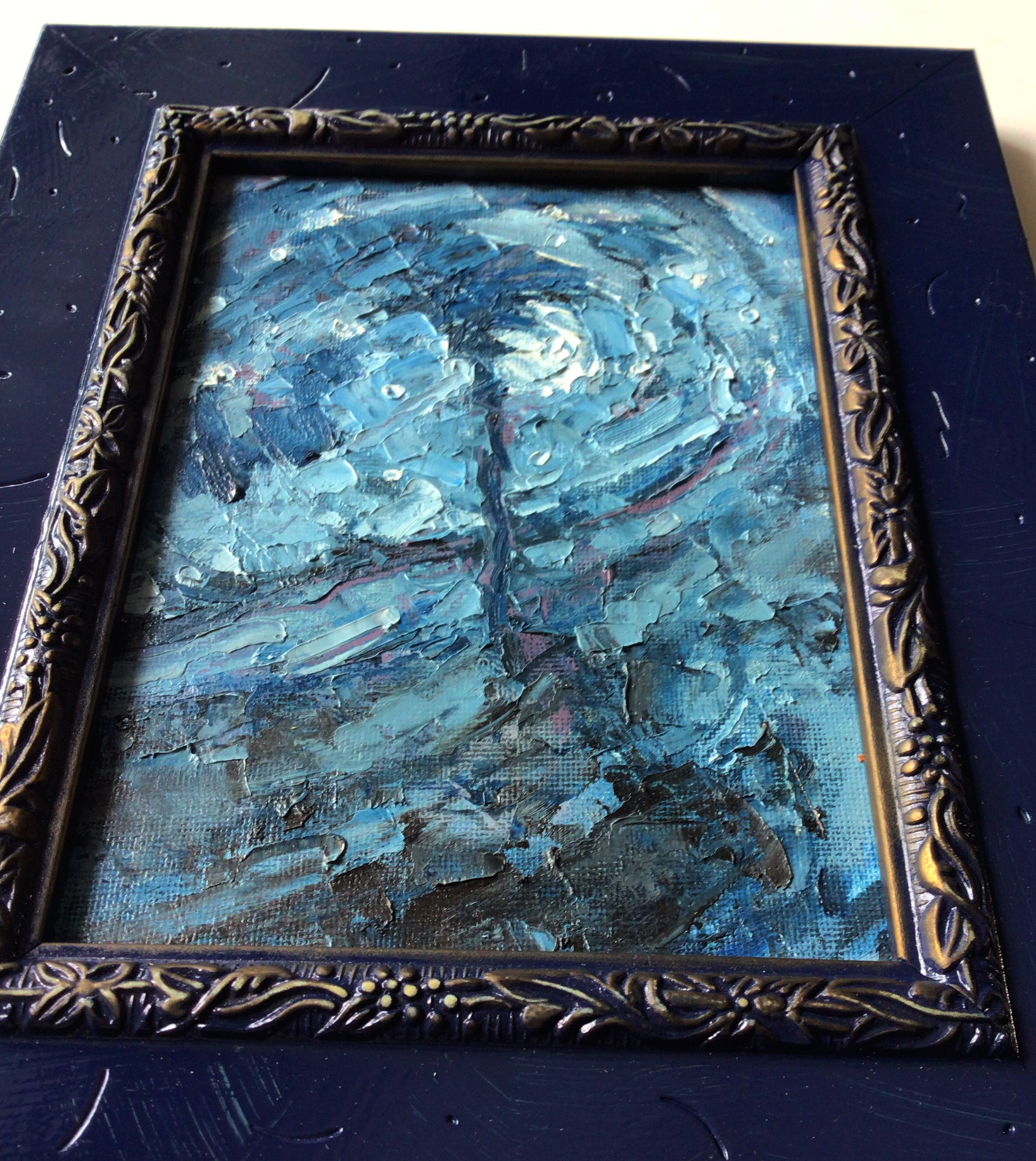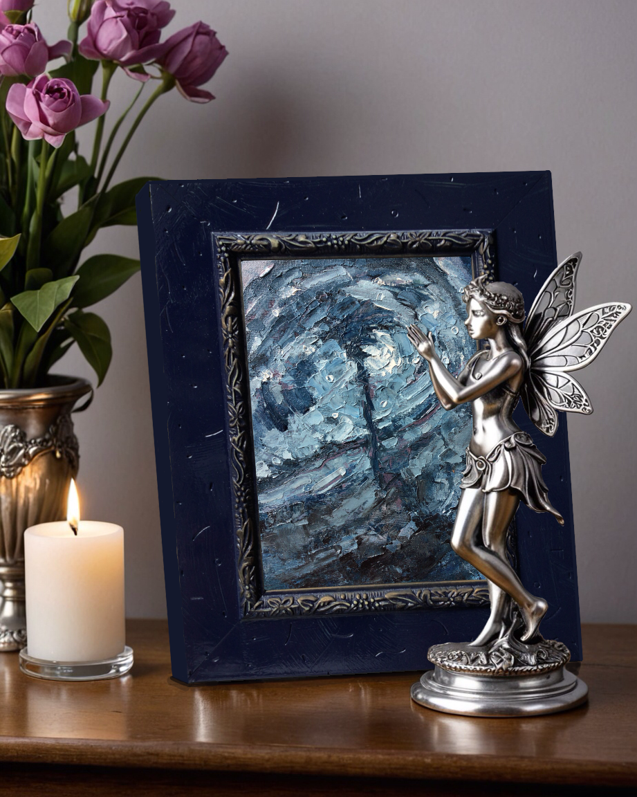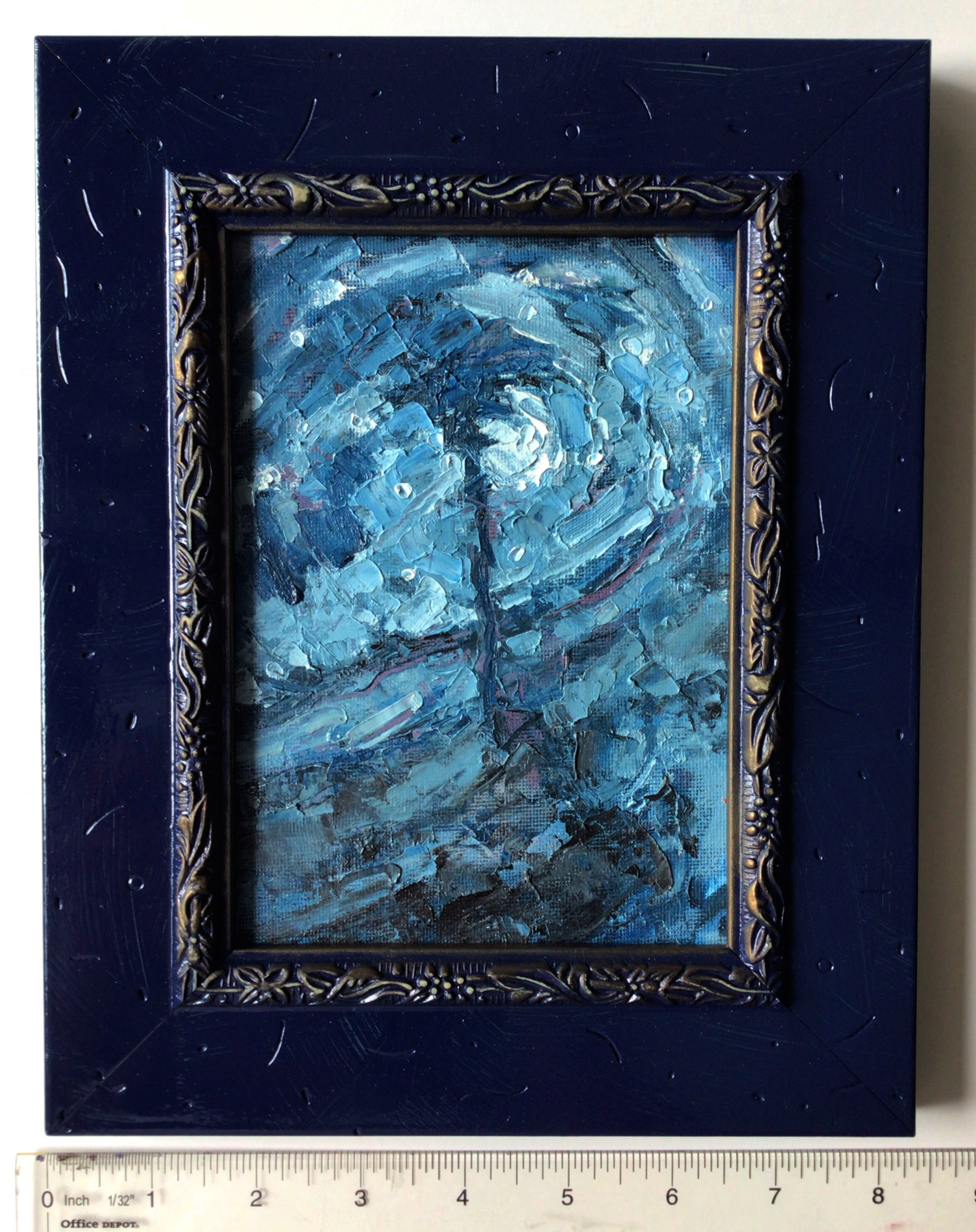 This painting measures 8" x 10" (Framed Dimension) and is in a hand painted semi-ornate frame that is ready to hang. The painting is further protected by a coat of matte varnish.