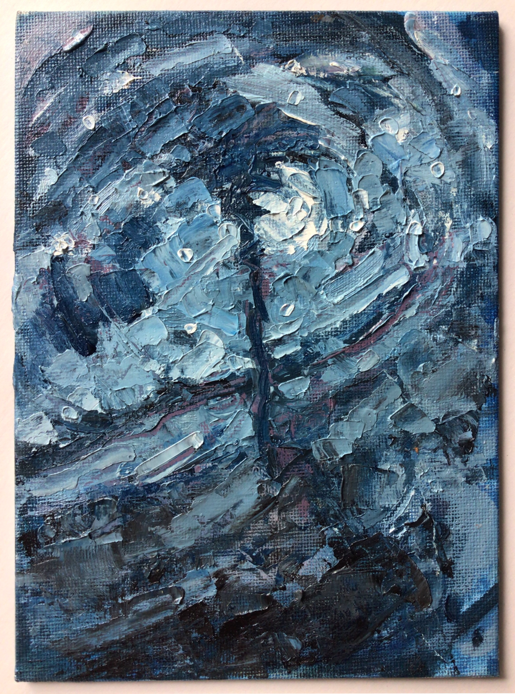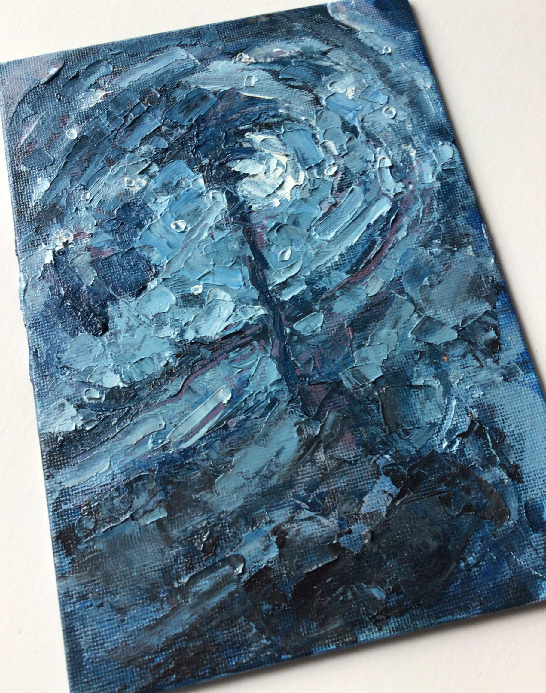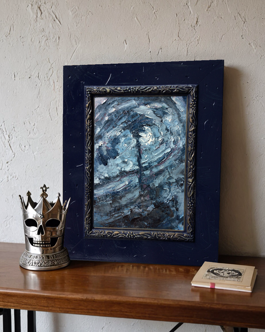 The moon and stars peek in and out of sight between the clouds putting on their nightly show for the solitary palm tree. Original fine art oil painting featuring rich pallet knife work rendered on a canvas panel.