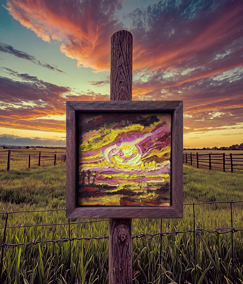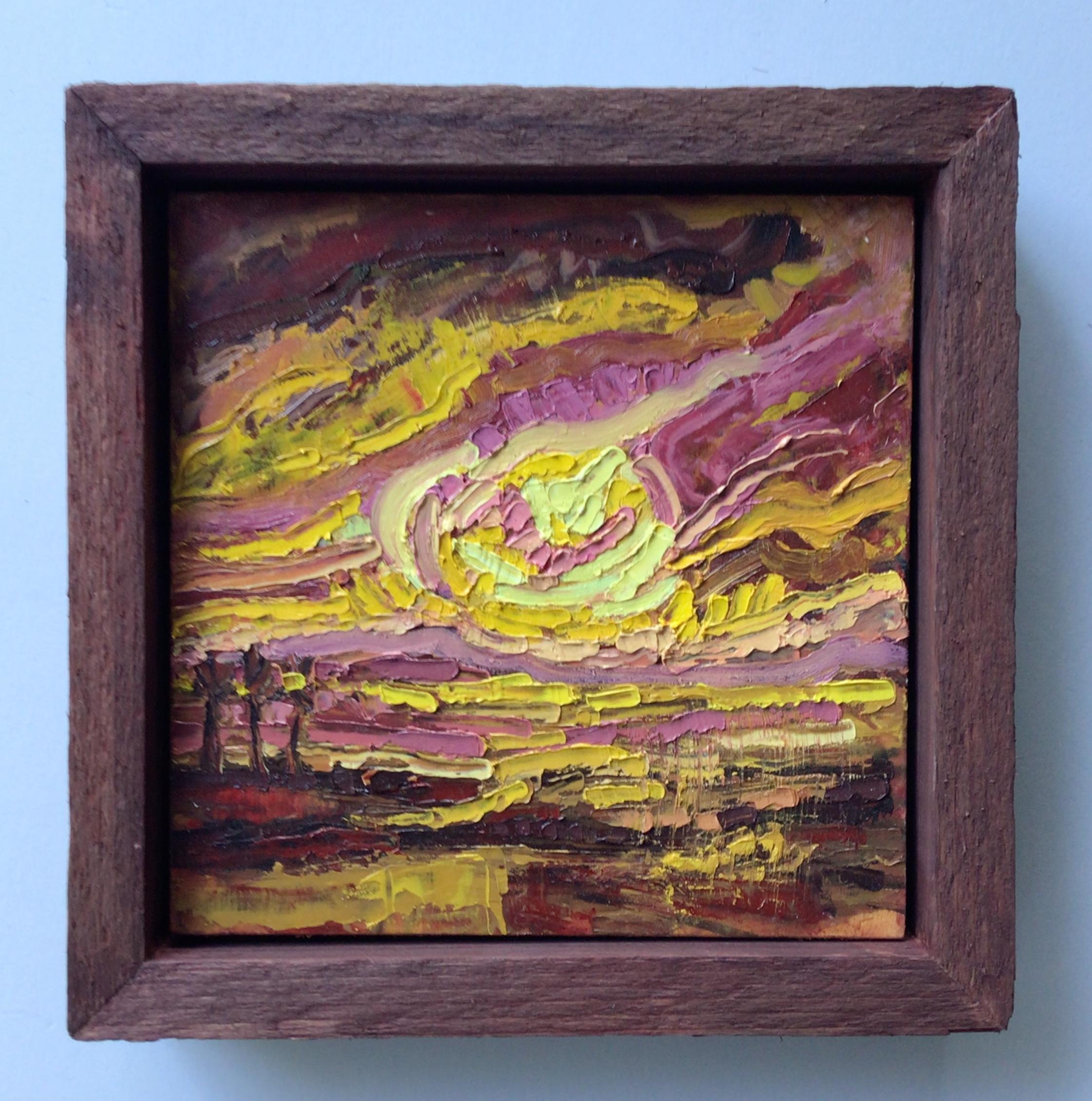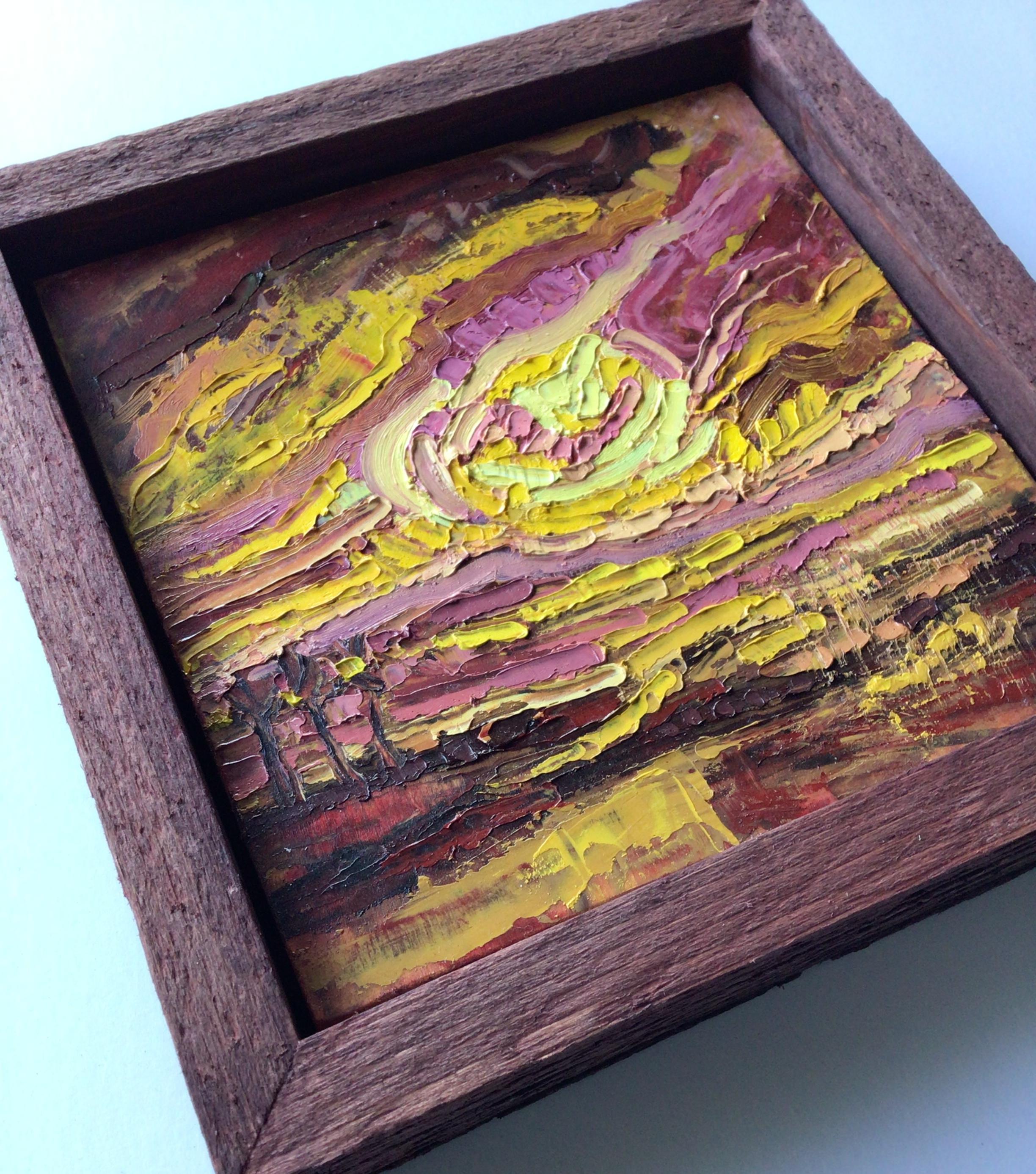 It is almost as if the afternoon sky is trying to make a statement with its deep colors, radical swirls, and abundant presence.  Don't let the small size fool you, this painting stands on it's own.