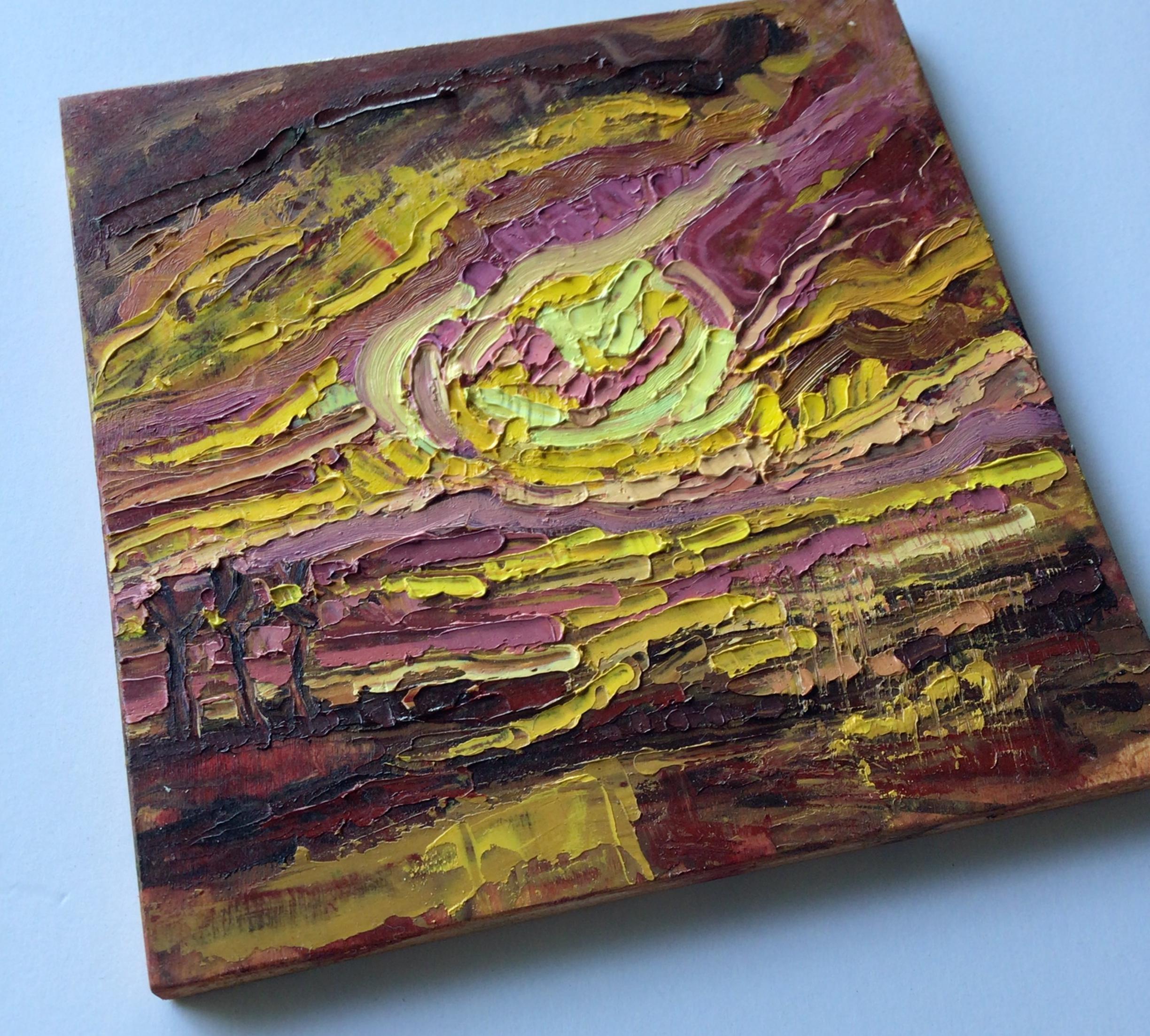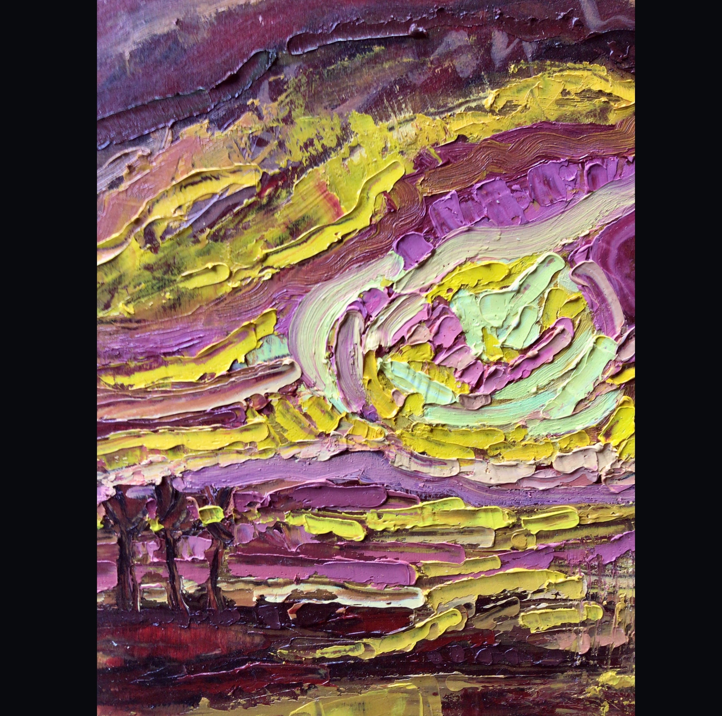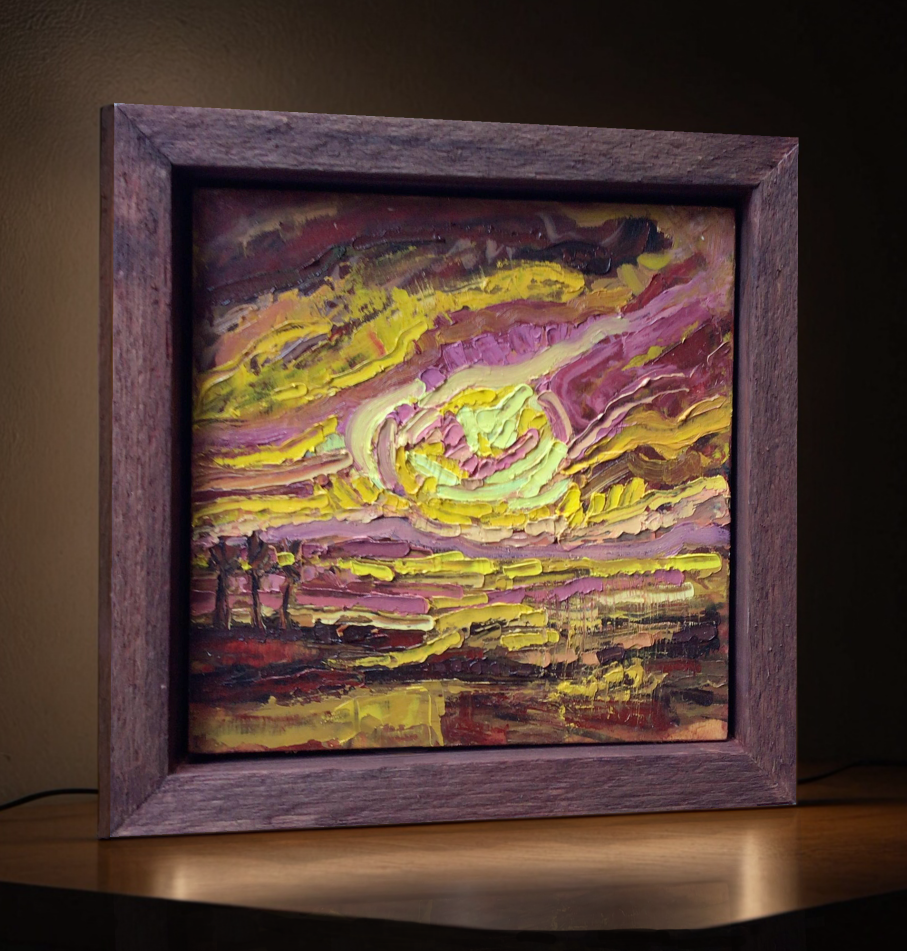 It is almost as if the afternoon sky is trying to make a statement with its deep colors, radical swirls, and abundant presence.  Don't let the small size fool you, this painting stands on it's own.
