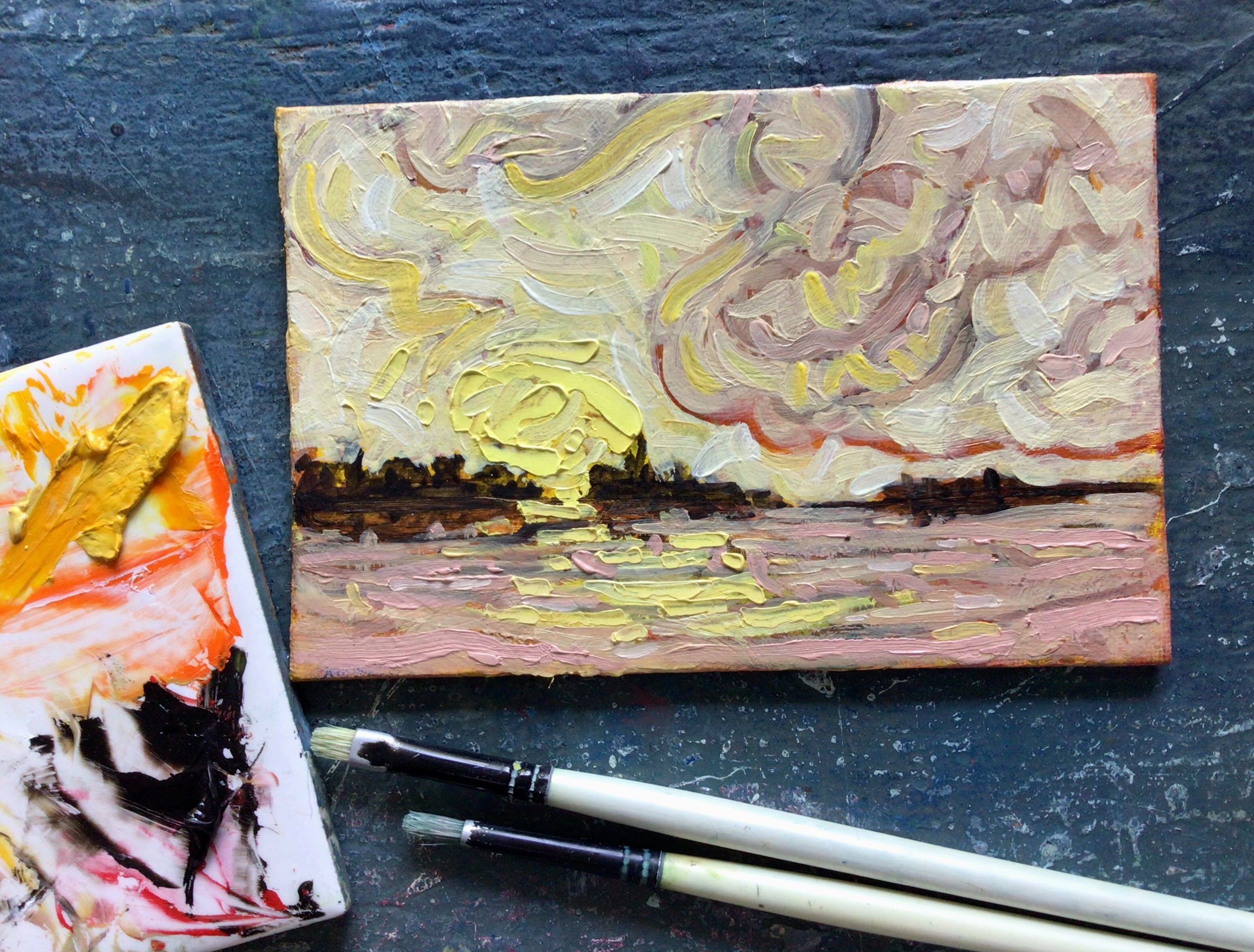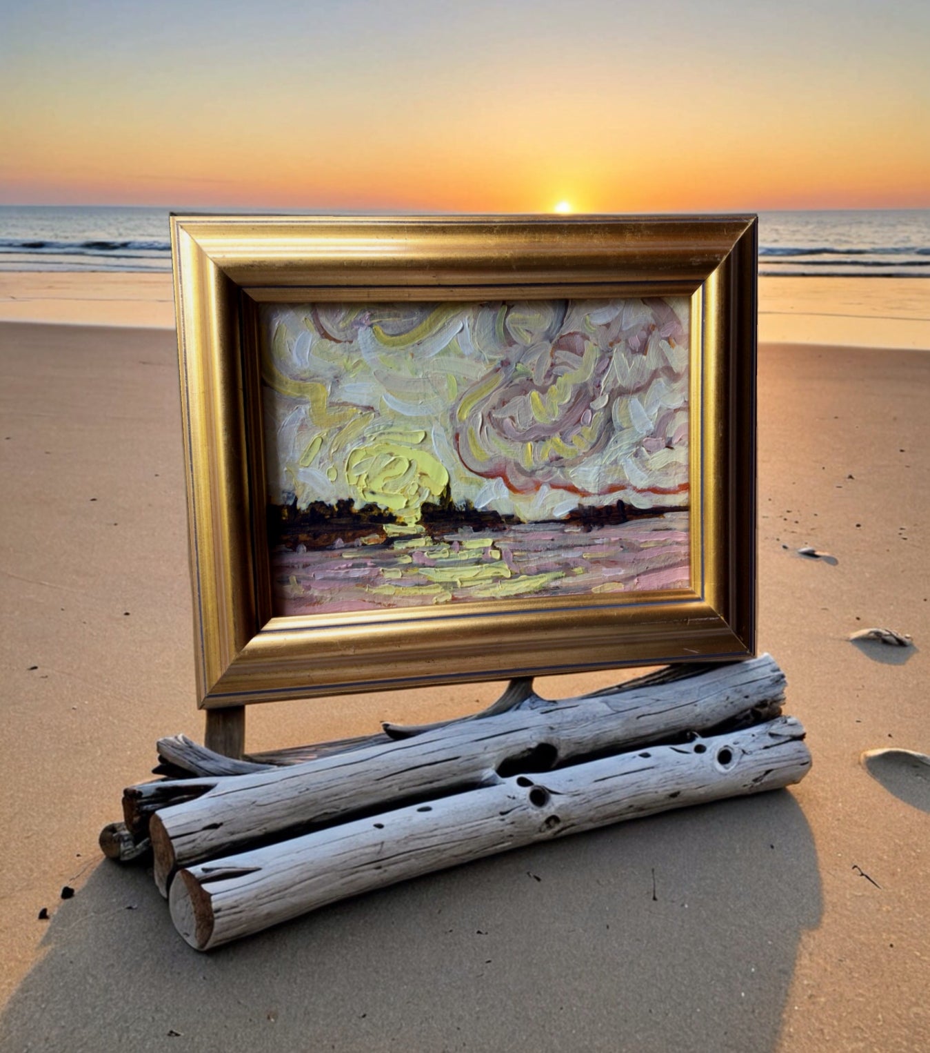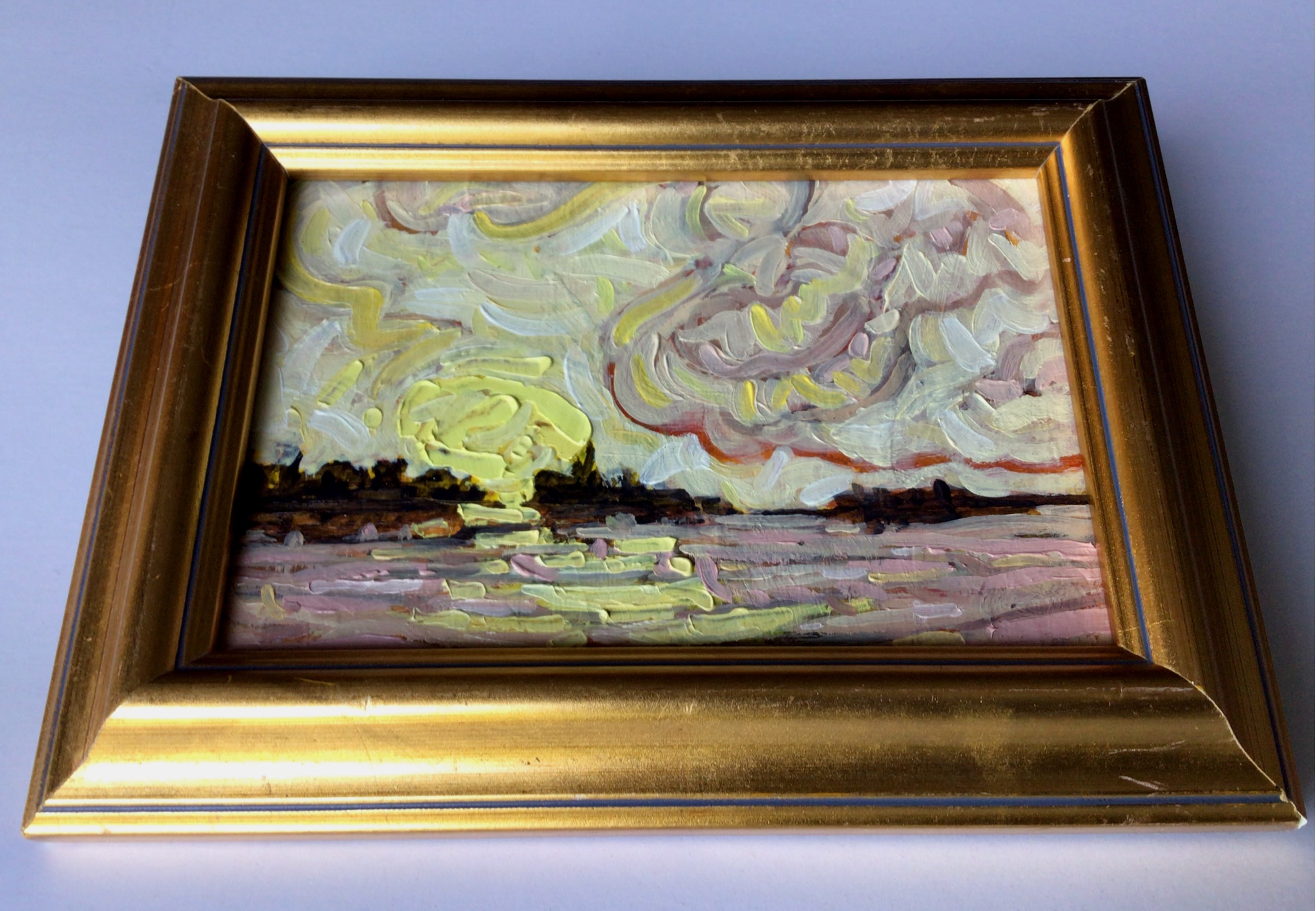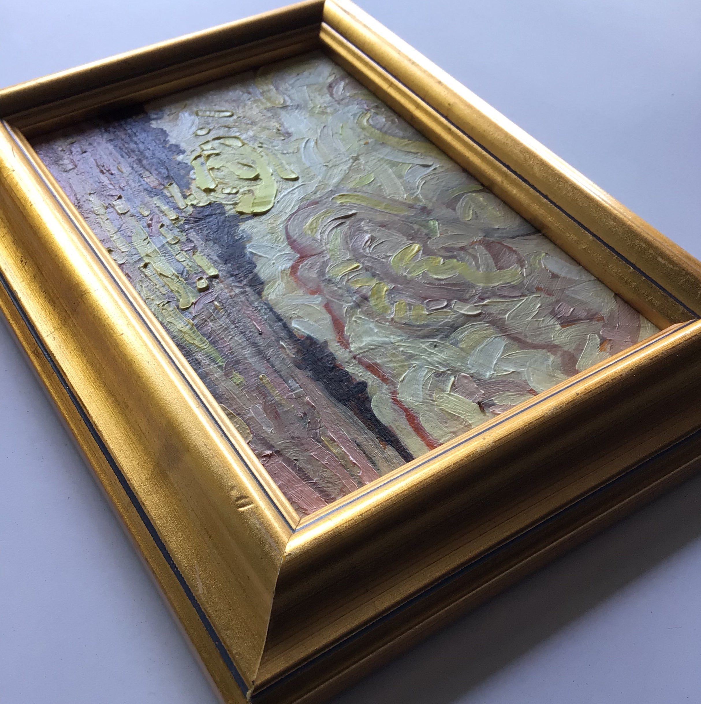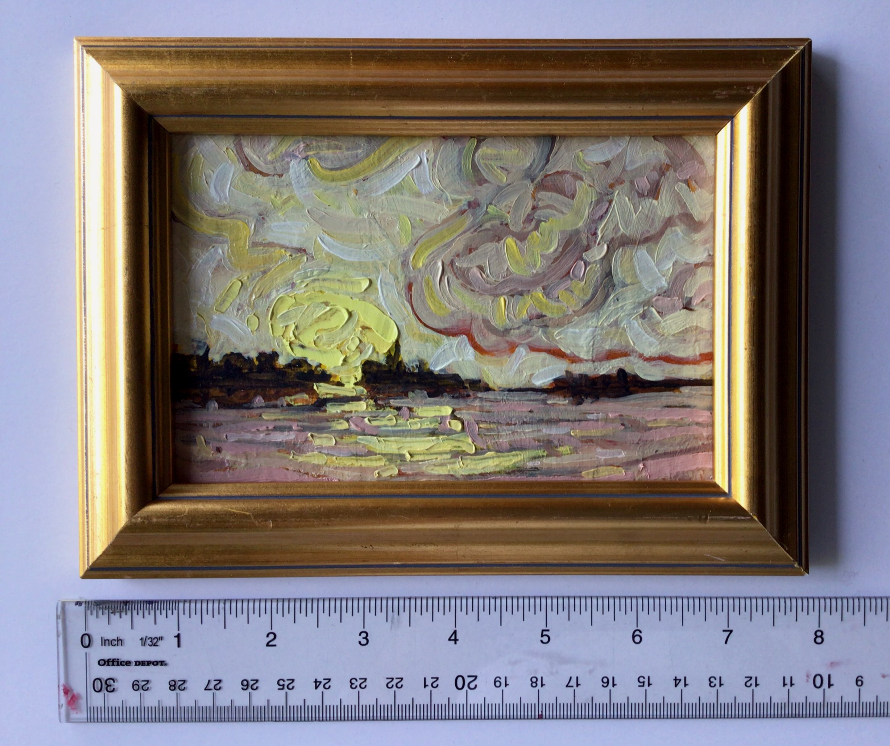 "So It Begins" Original 7.5" x 5.5" oil on canvas panel gold frame that is ready to hang. The painting is further protected by a coat of matte varnish.