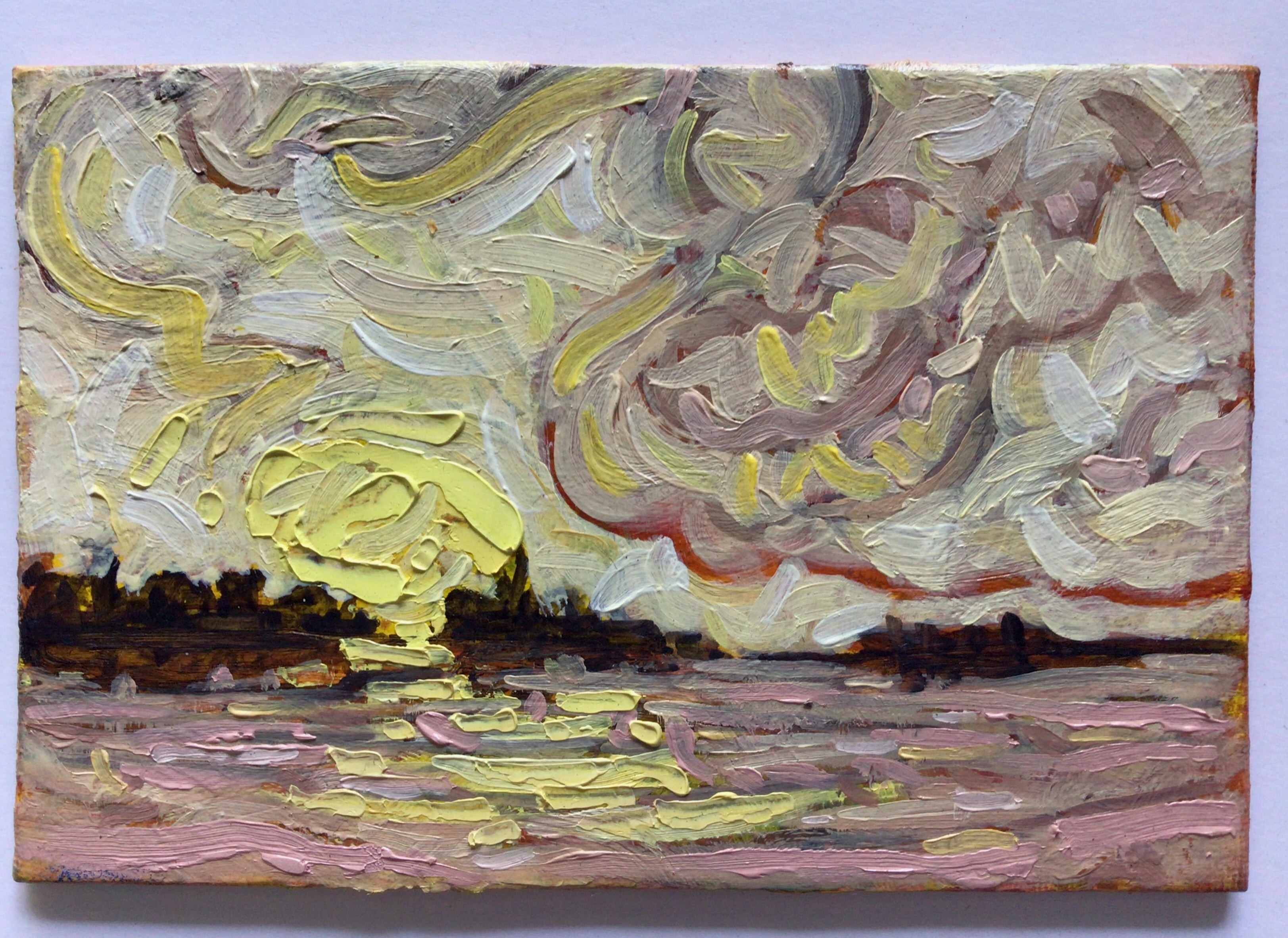 Original fine art oil painting of a delicate morning sunrise amidst the rolling clouds over the bay.