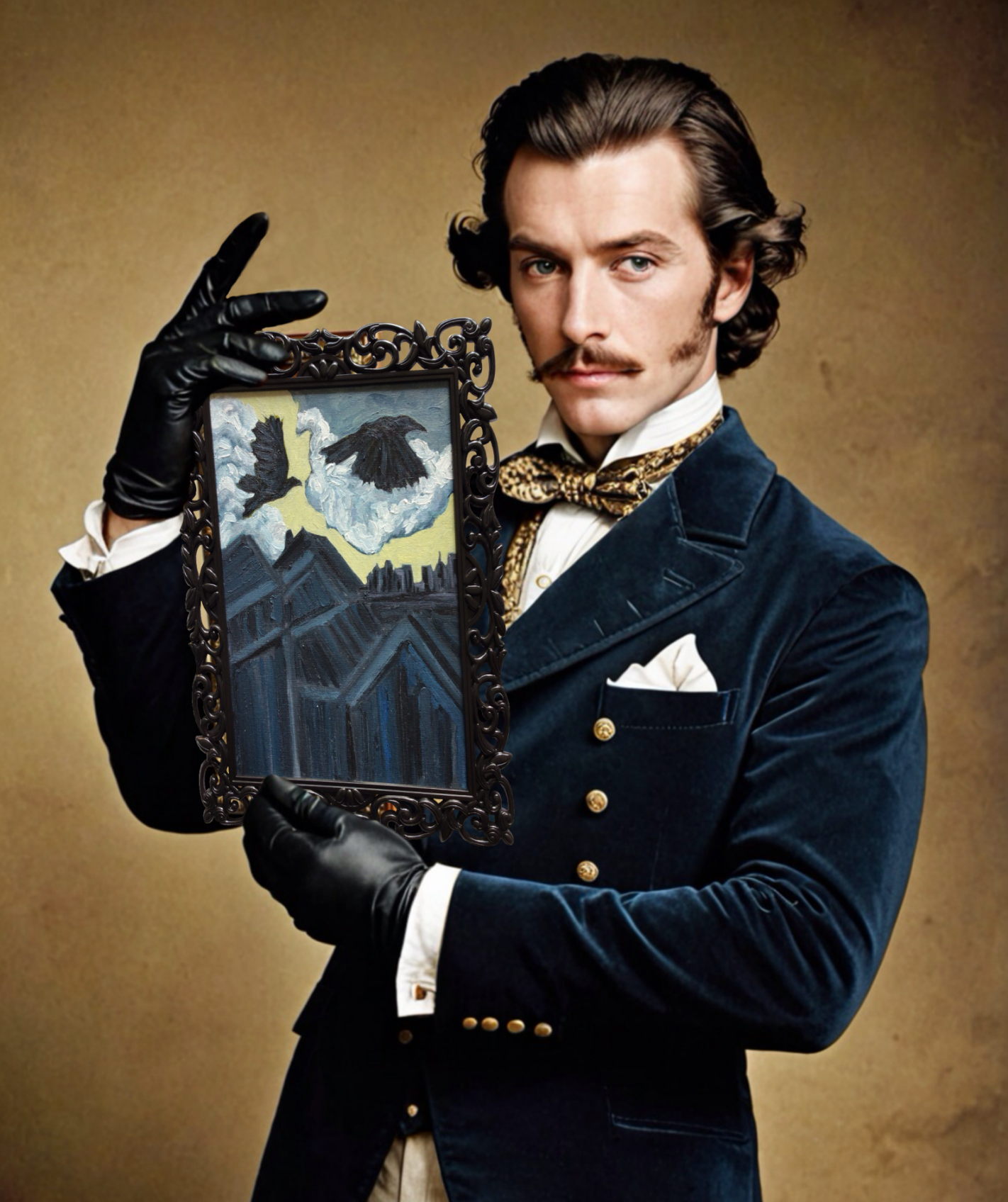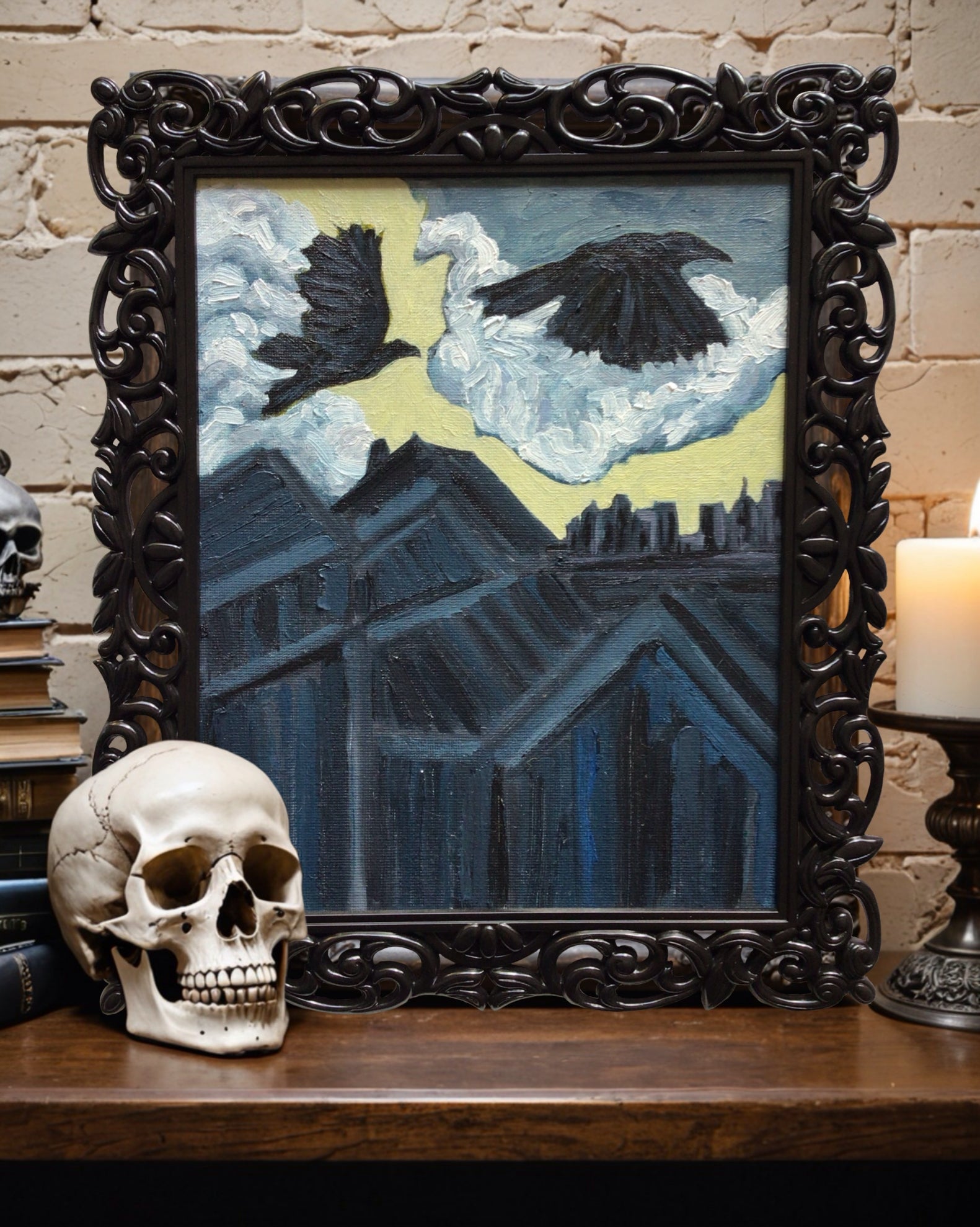 "Twilight of the Popular Crowd" Original 10.5" w x 12.5" h oil on canvas panel in an ornate, black metal frame.