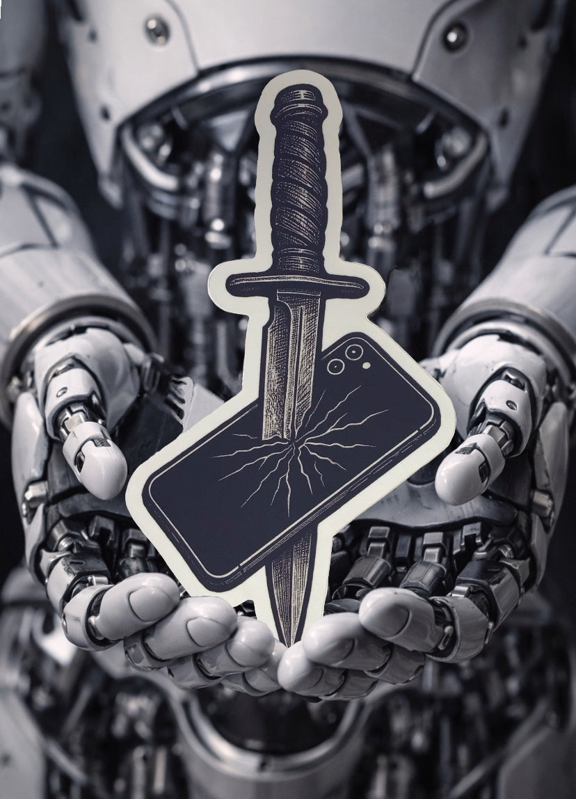 A medieval dagger pierces the illuminated screen of an iPhone. No blood. No hand. No figure. Just steel against glass.
