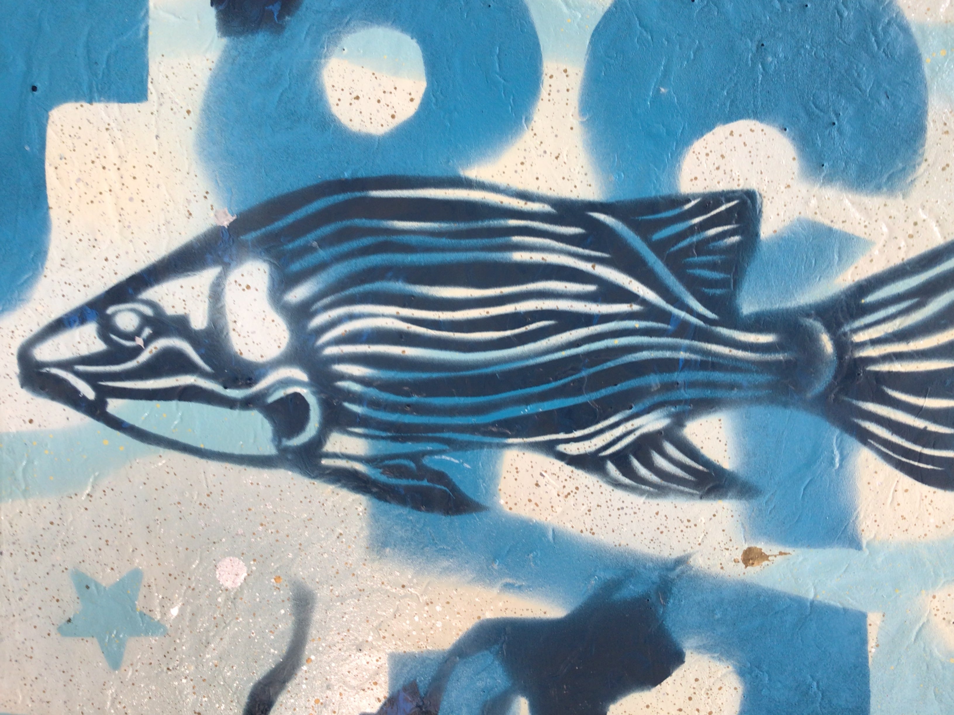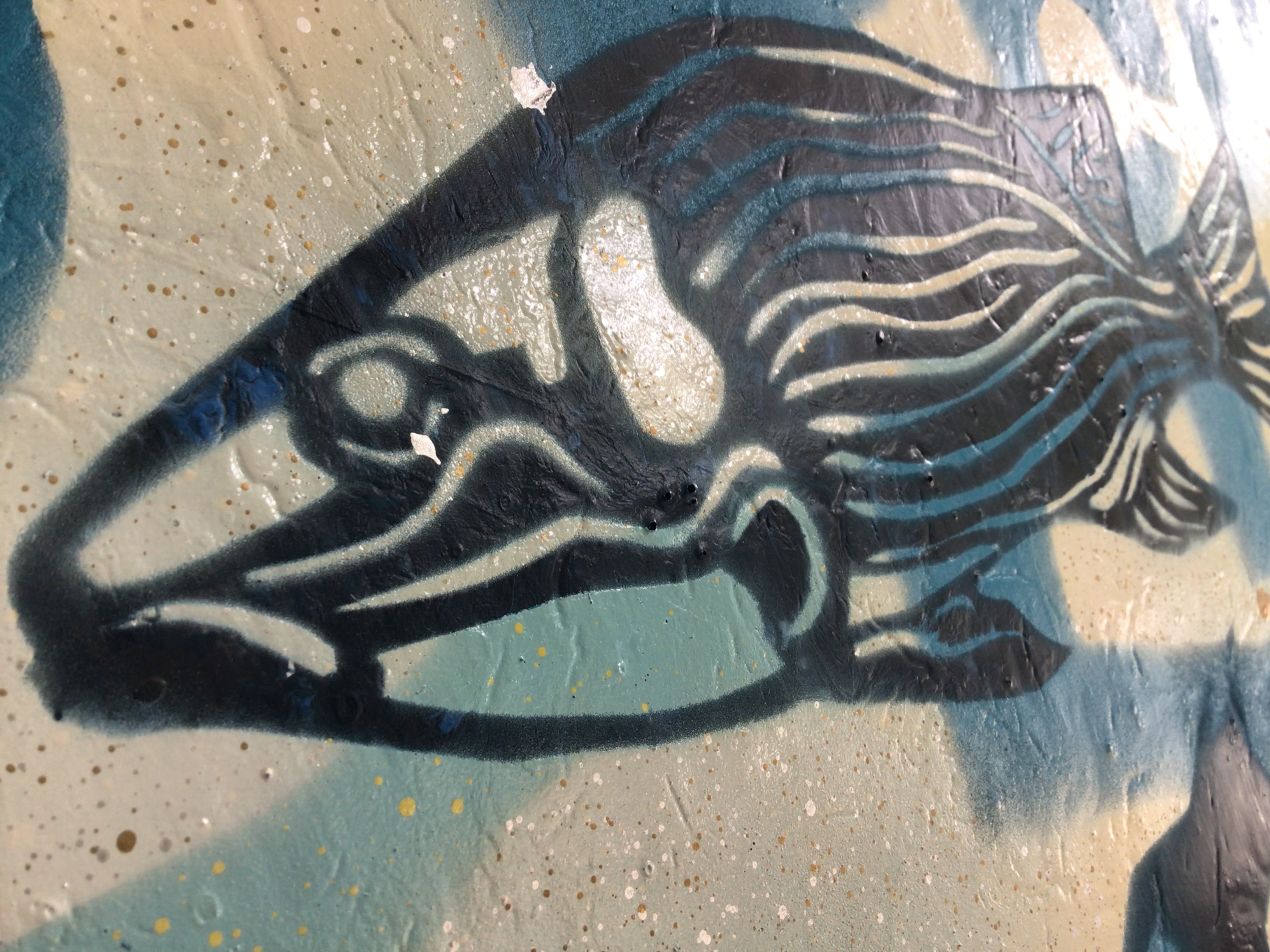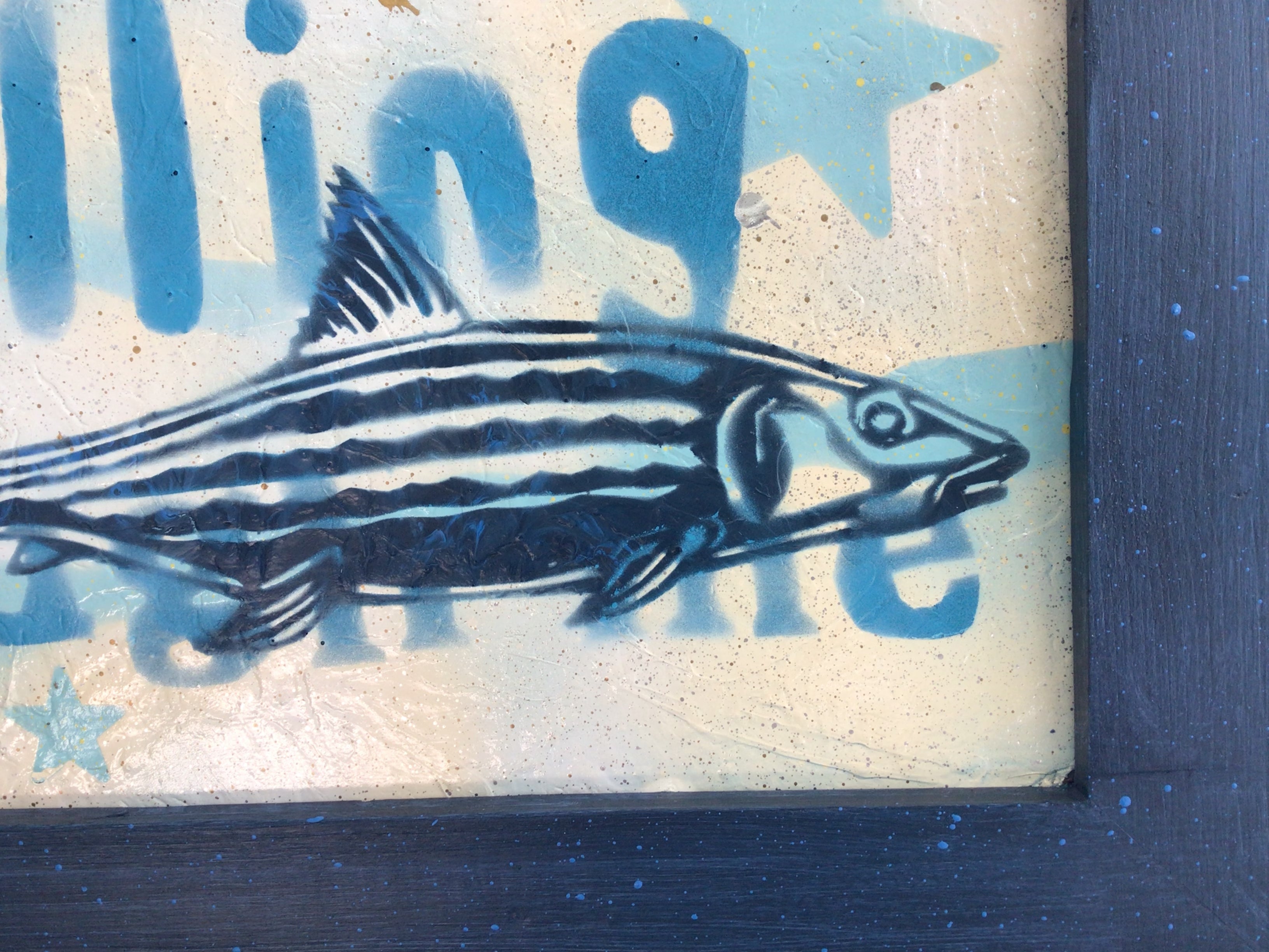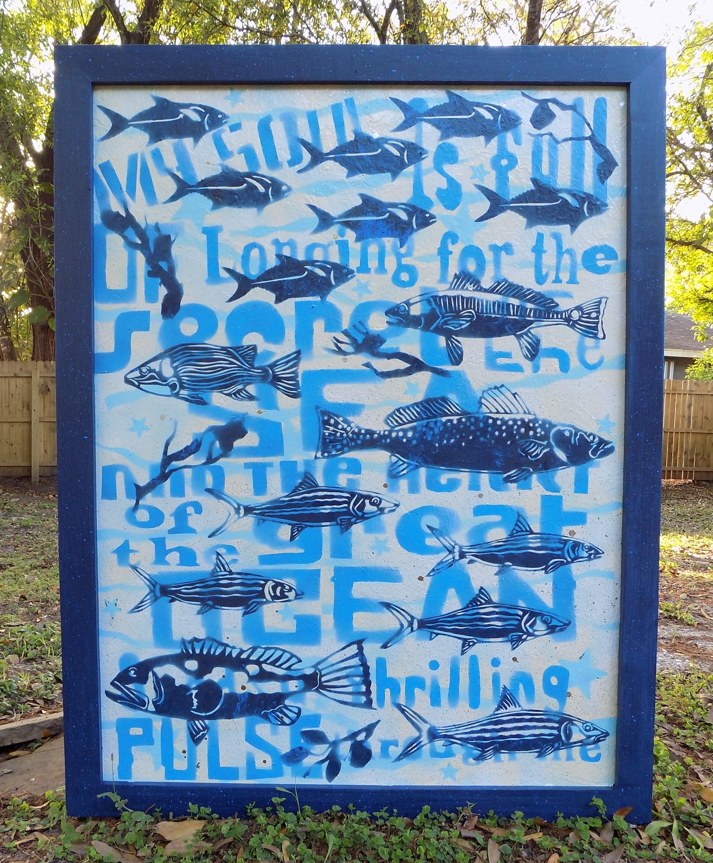 "Secret of the Sea" - Original 41" x 53" (framed dimension) acrylic and spray enamel over hand cut stencils in a studio made, hand painted frame.
