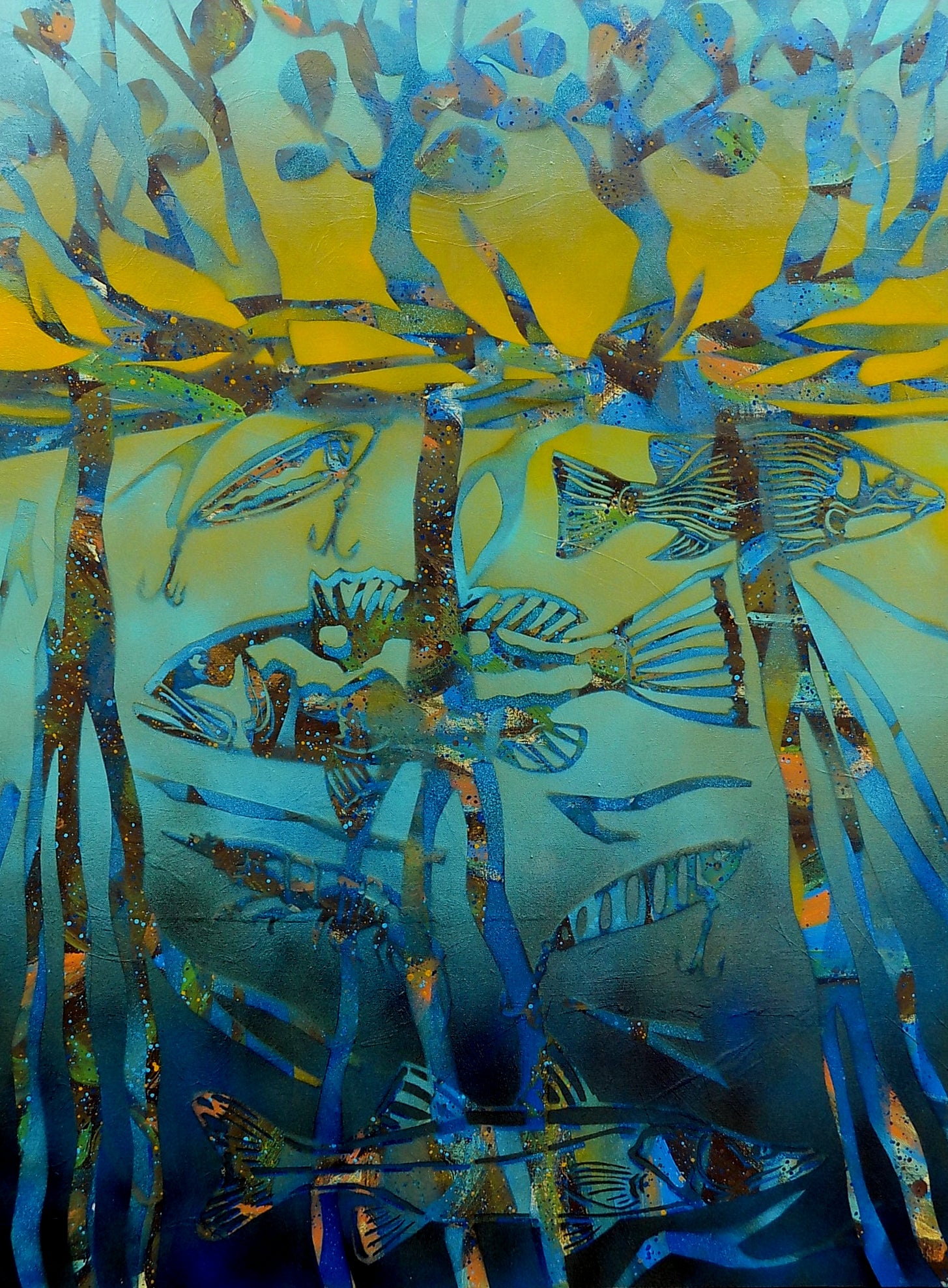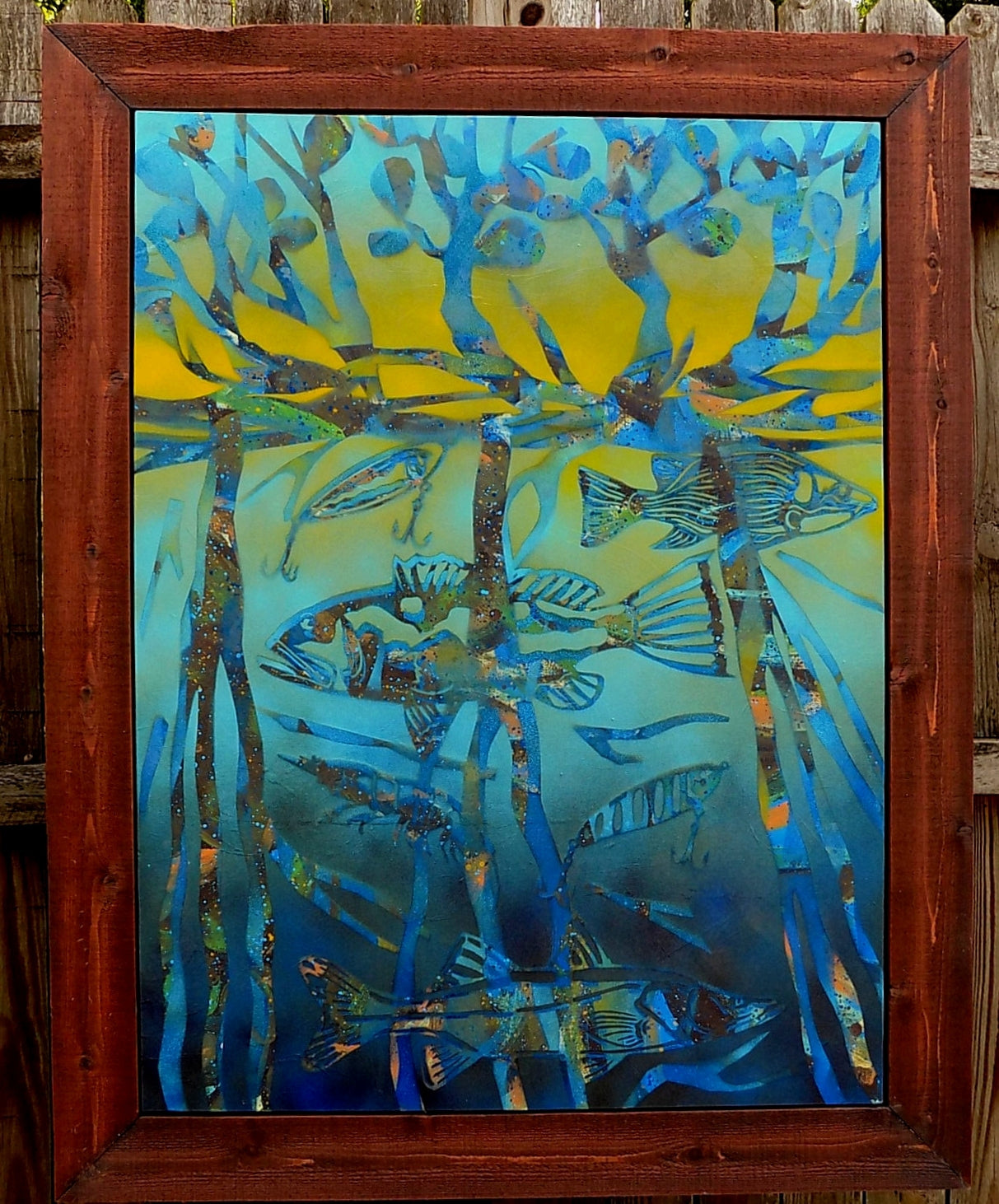 'Time to Fish or Walk'  Original 37" x 47" (framed dimension) enamel and acrylic on wood panel in a studio made, stained, natural cedar frame.