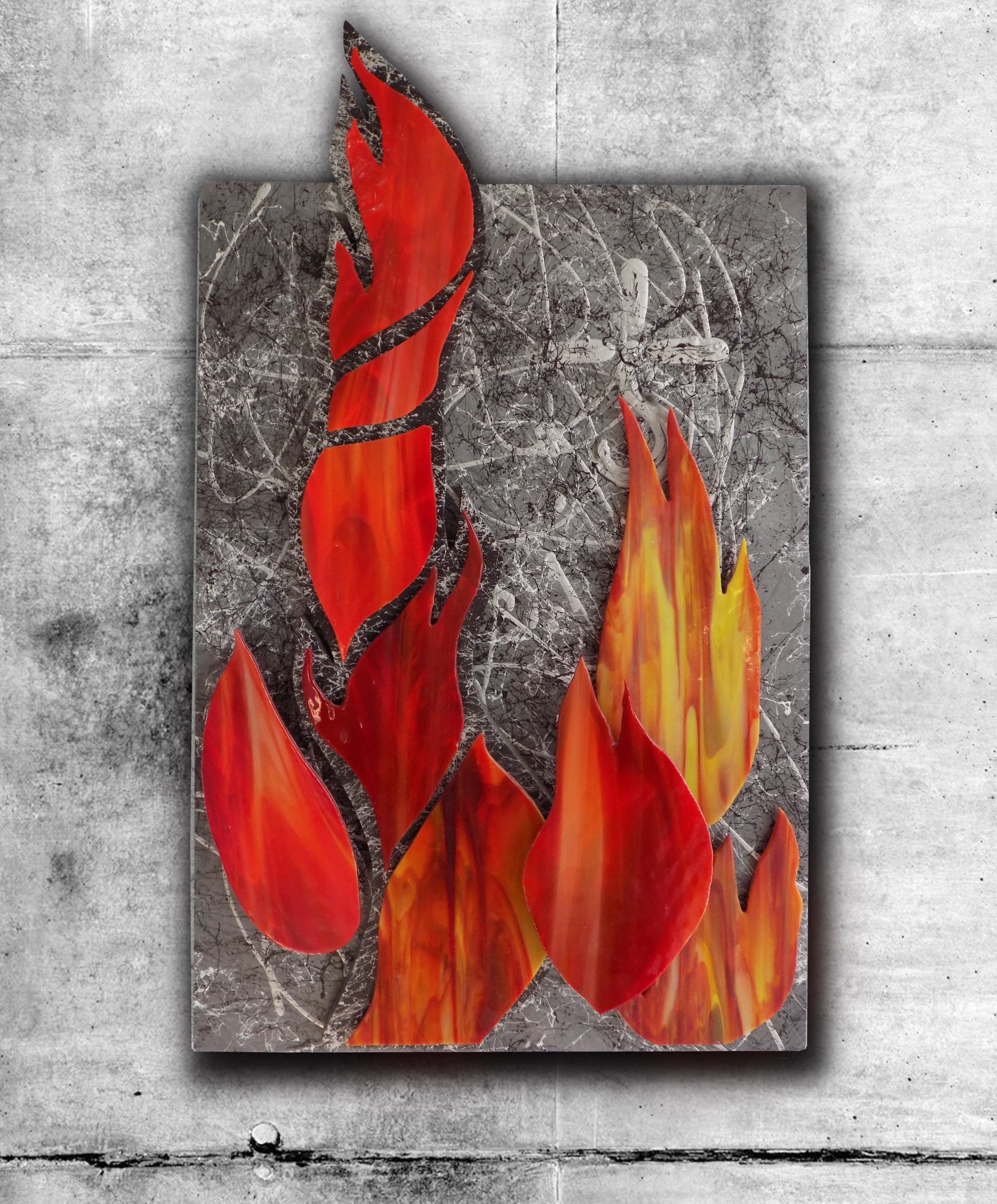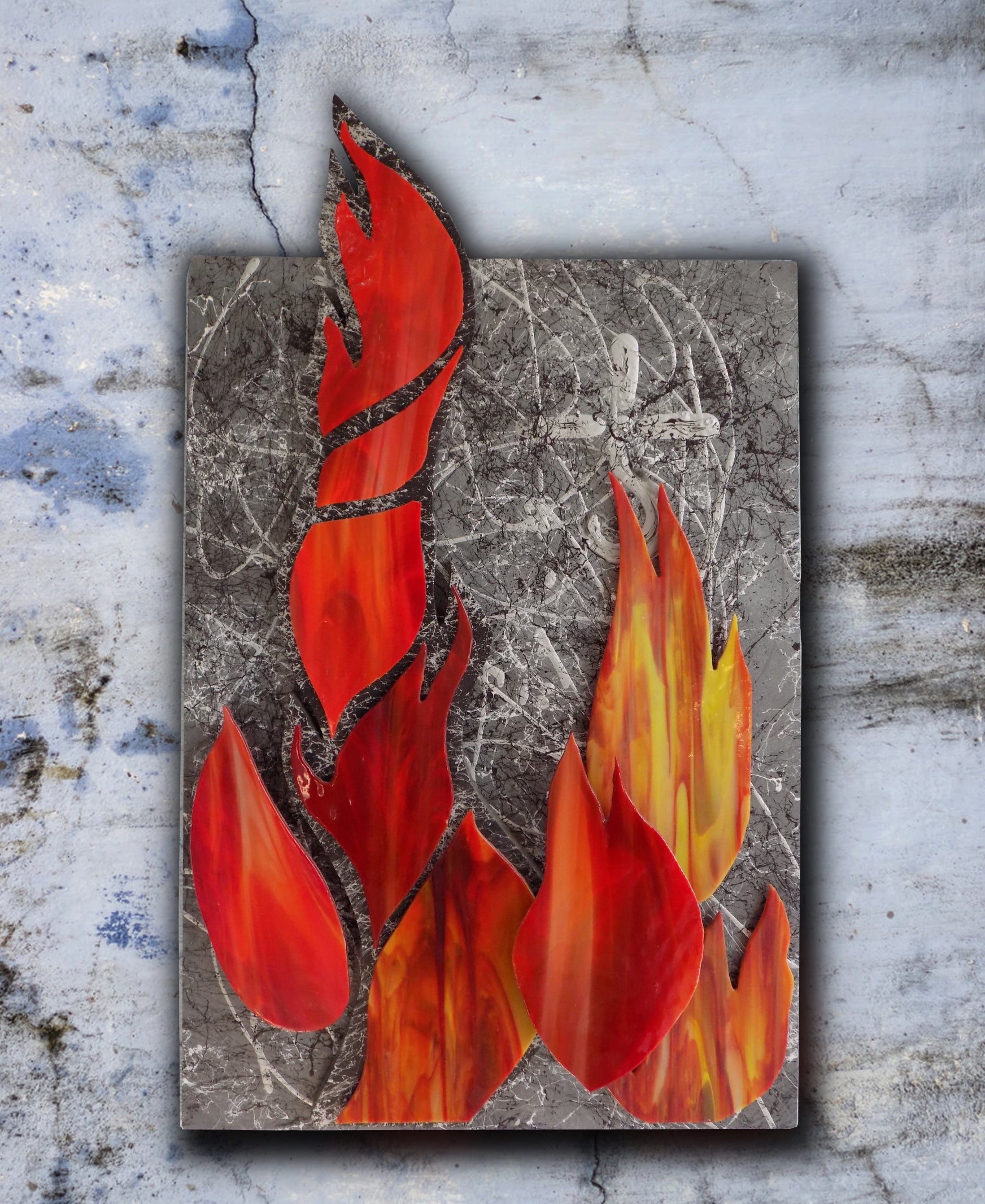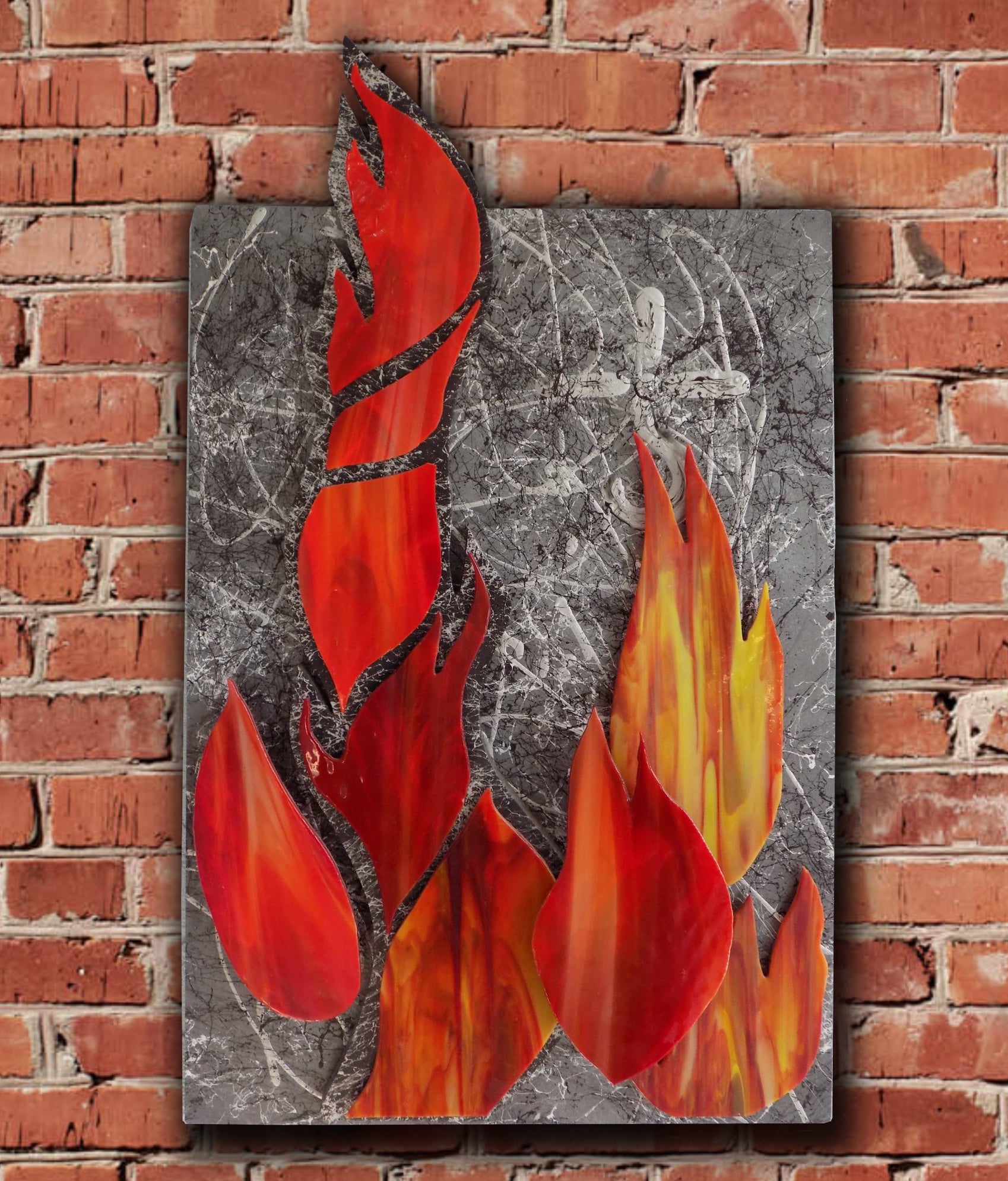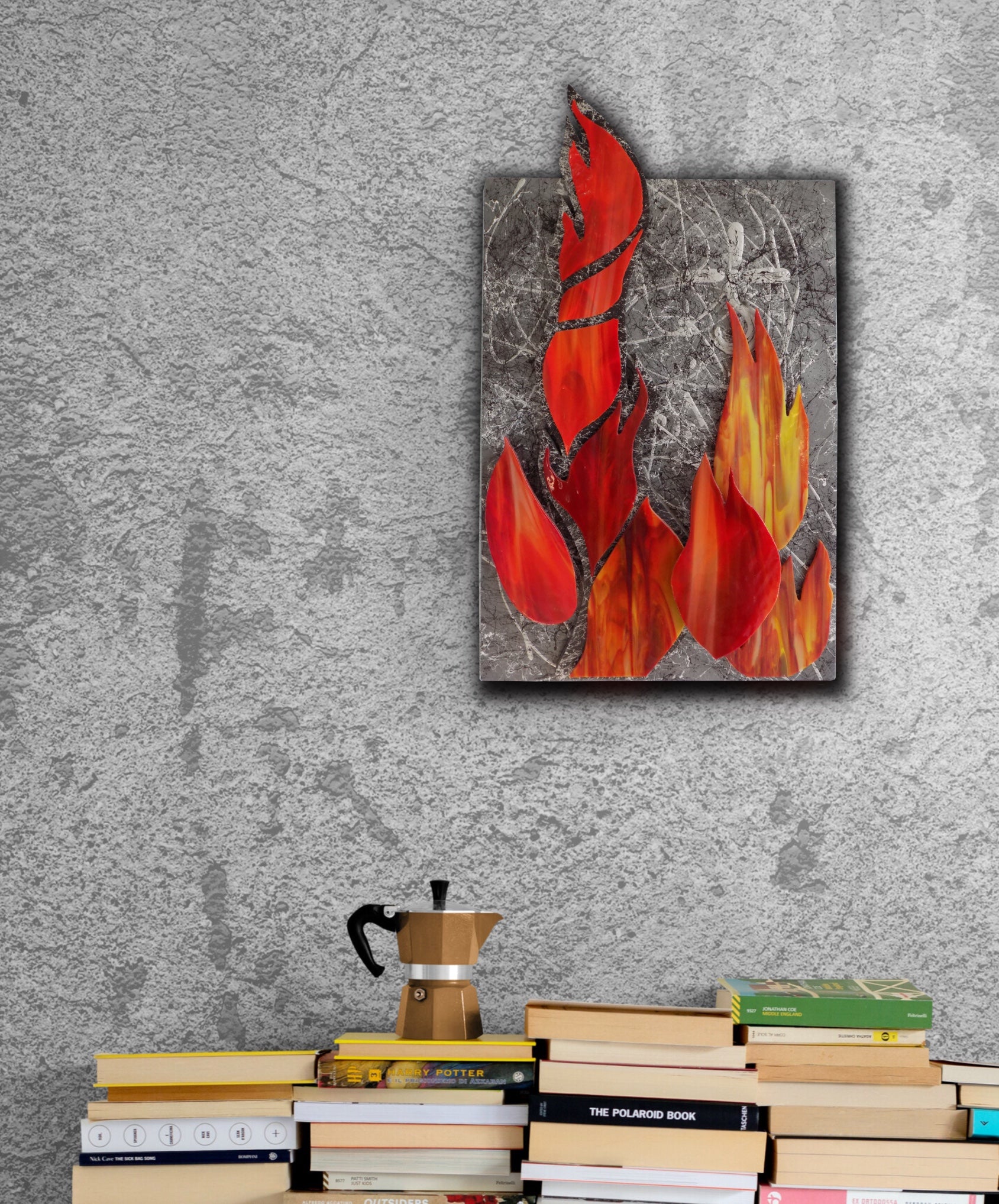 "Burnin’ For You" - 13" x 25" Original mixed media fused glass on an abstract painted wood panel in a studio made decorative wood frame by artist Helen Geremia.