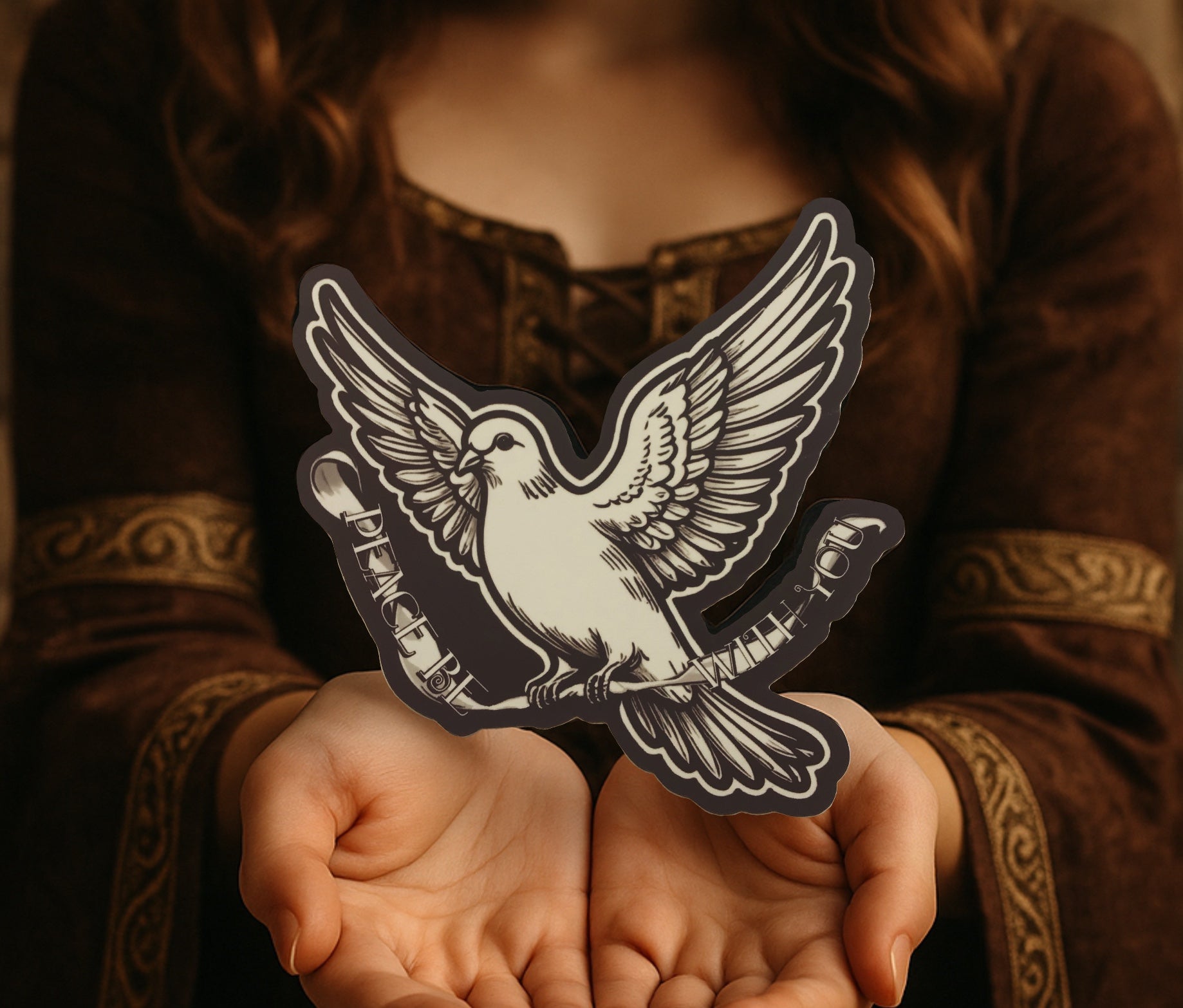 In stark black and white, as if cut from a page of some forgotten Gothic breviary, a dove breaks across the silent air. Its wings stretch wide; pure, bright, and almost luminous against the dark. This is no mere bird, but the ancient bearer of messages, the herald of covenant, whose flight bridges what is above with what is below. From its grip trails a small, unfurled weathered banner, delicate yet resolute. Upon it appear the words first spoken by the risen Christ to His trembling friends: “Peace be with you.”