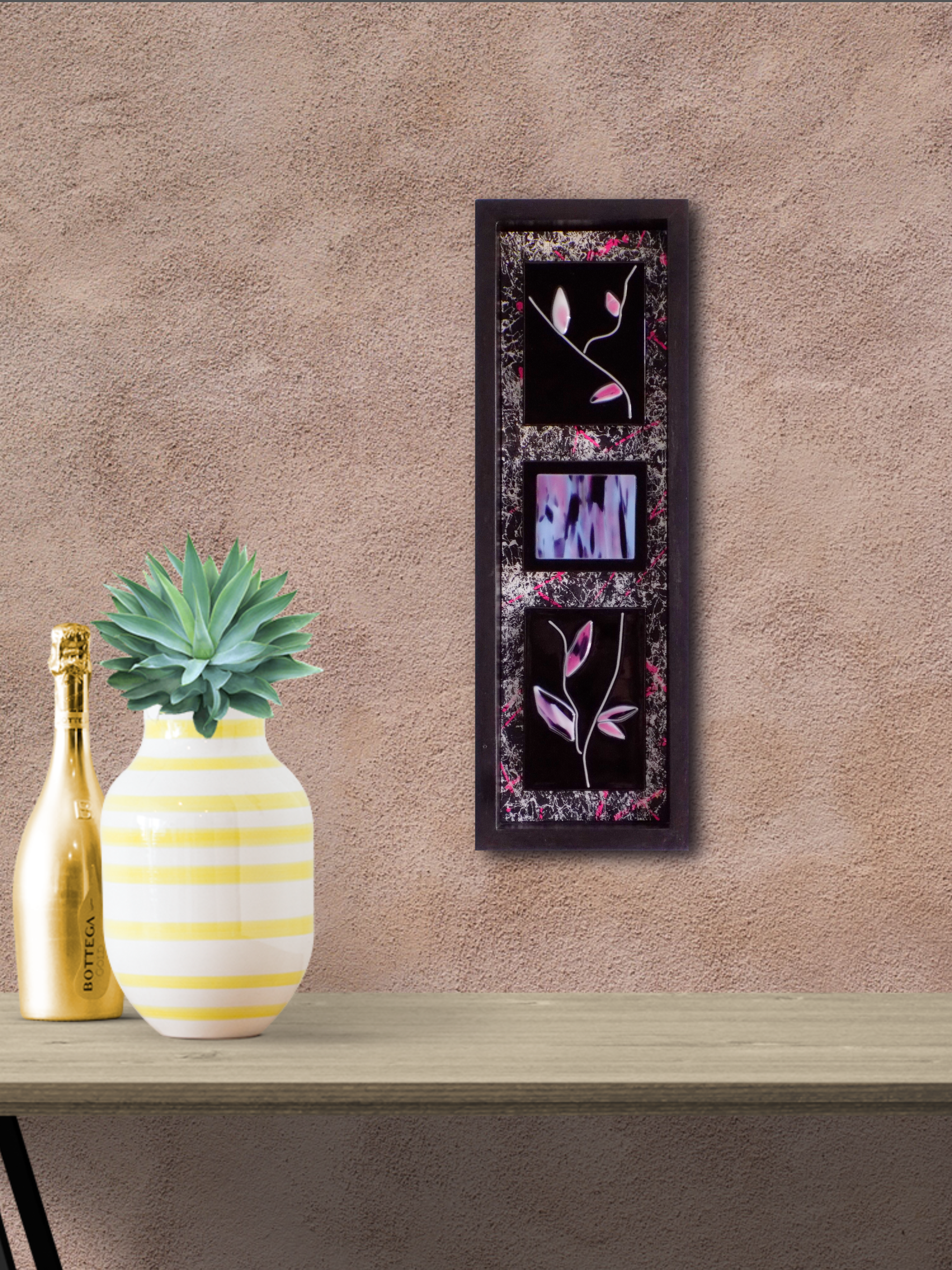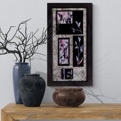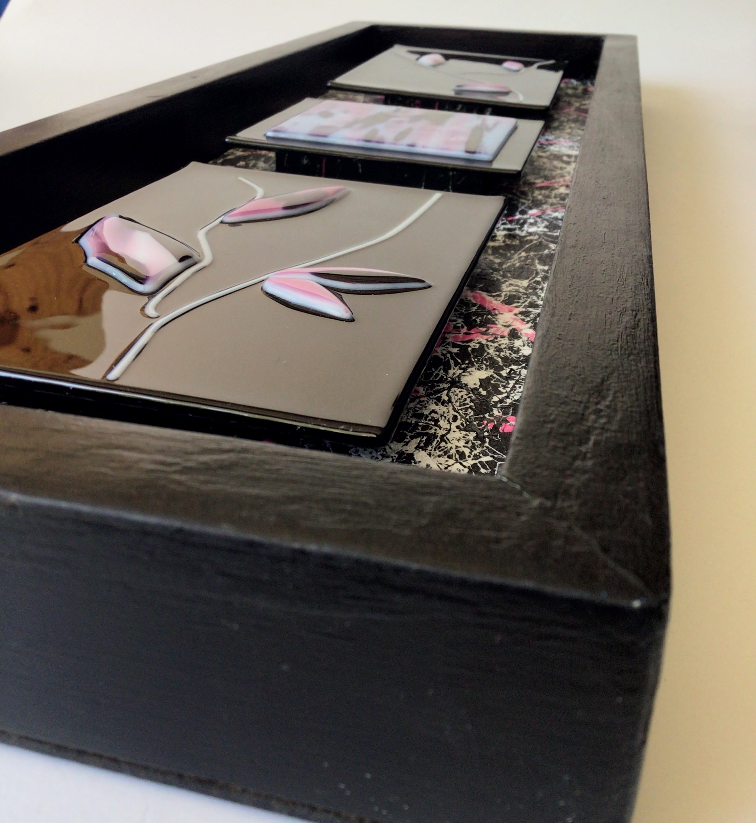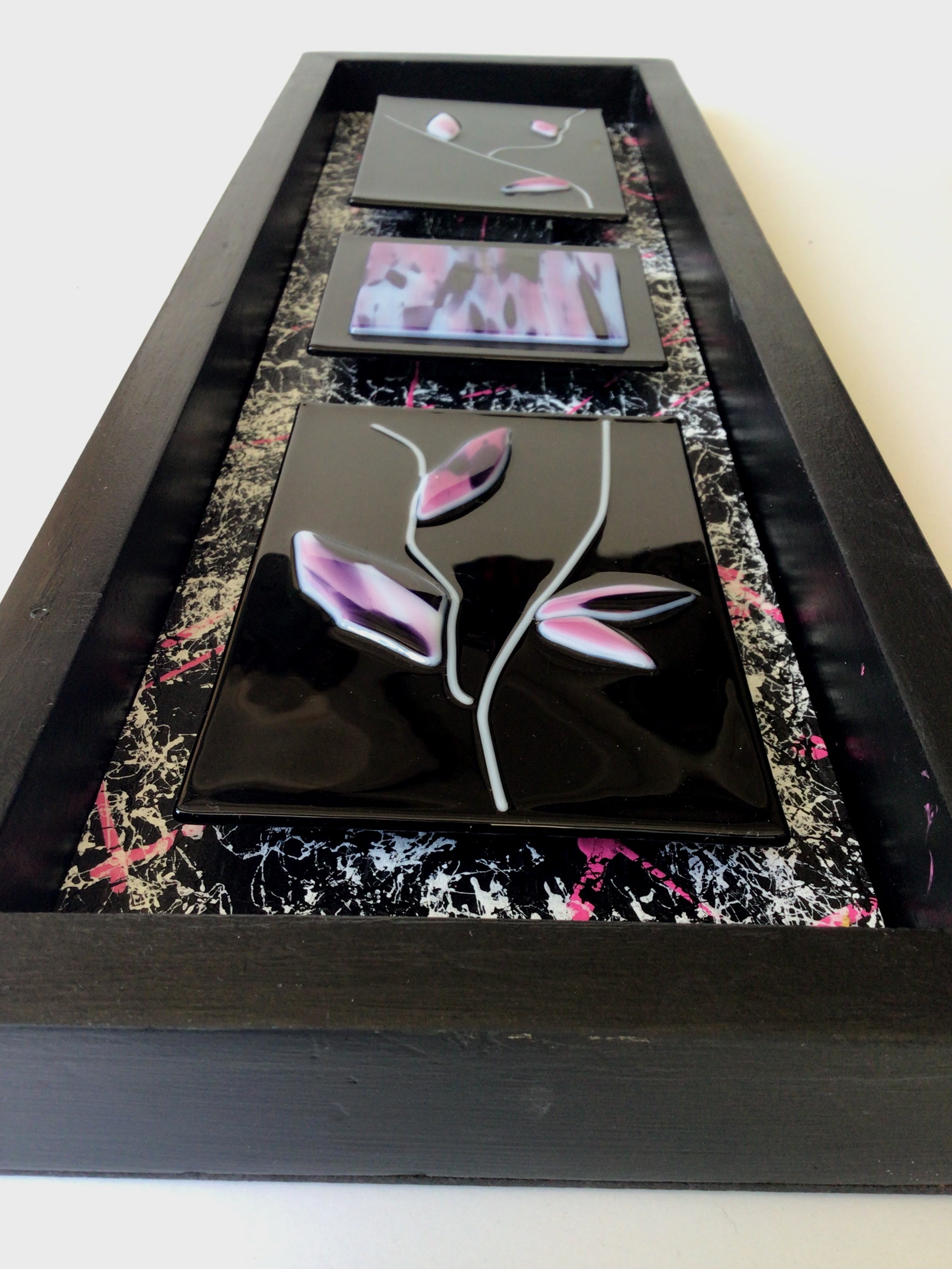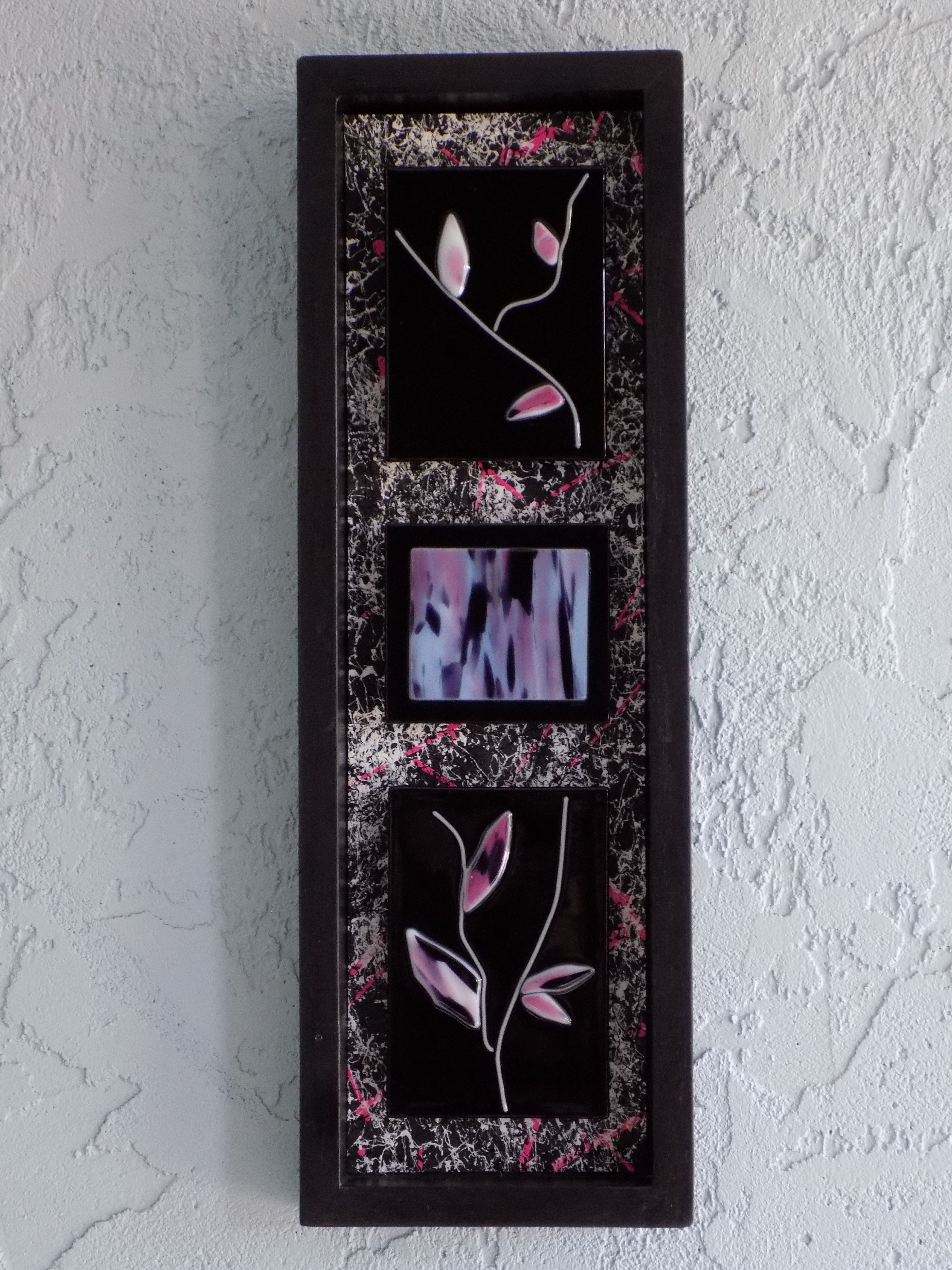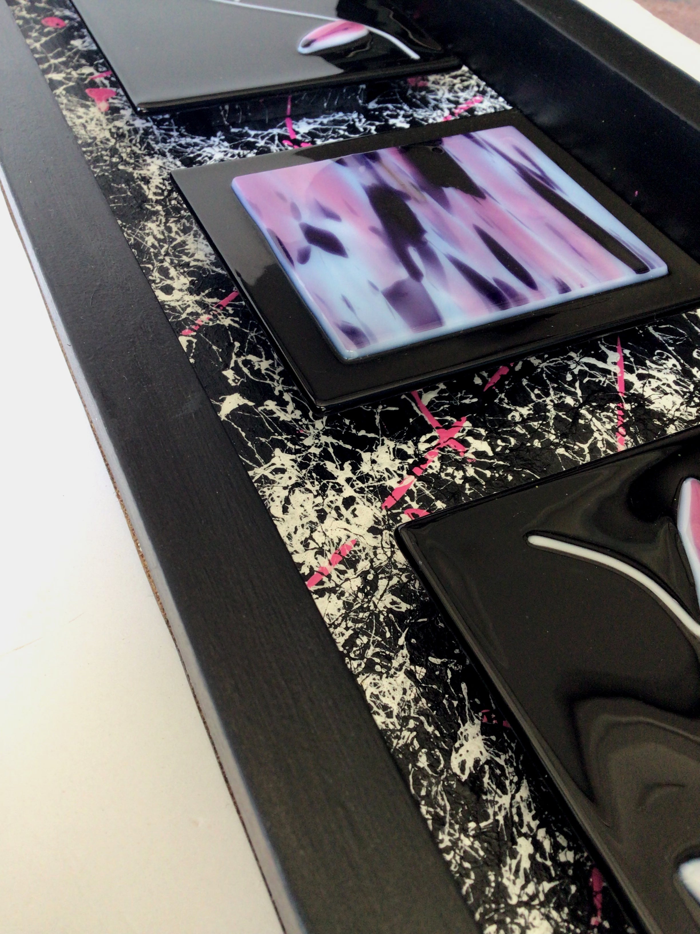 "Immortality 2" - 7.5" x 22" Original mixed media fused glass on an abstract painted wood panel in a studio made decorative wood frame by artist Helen Geremia.