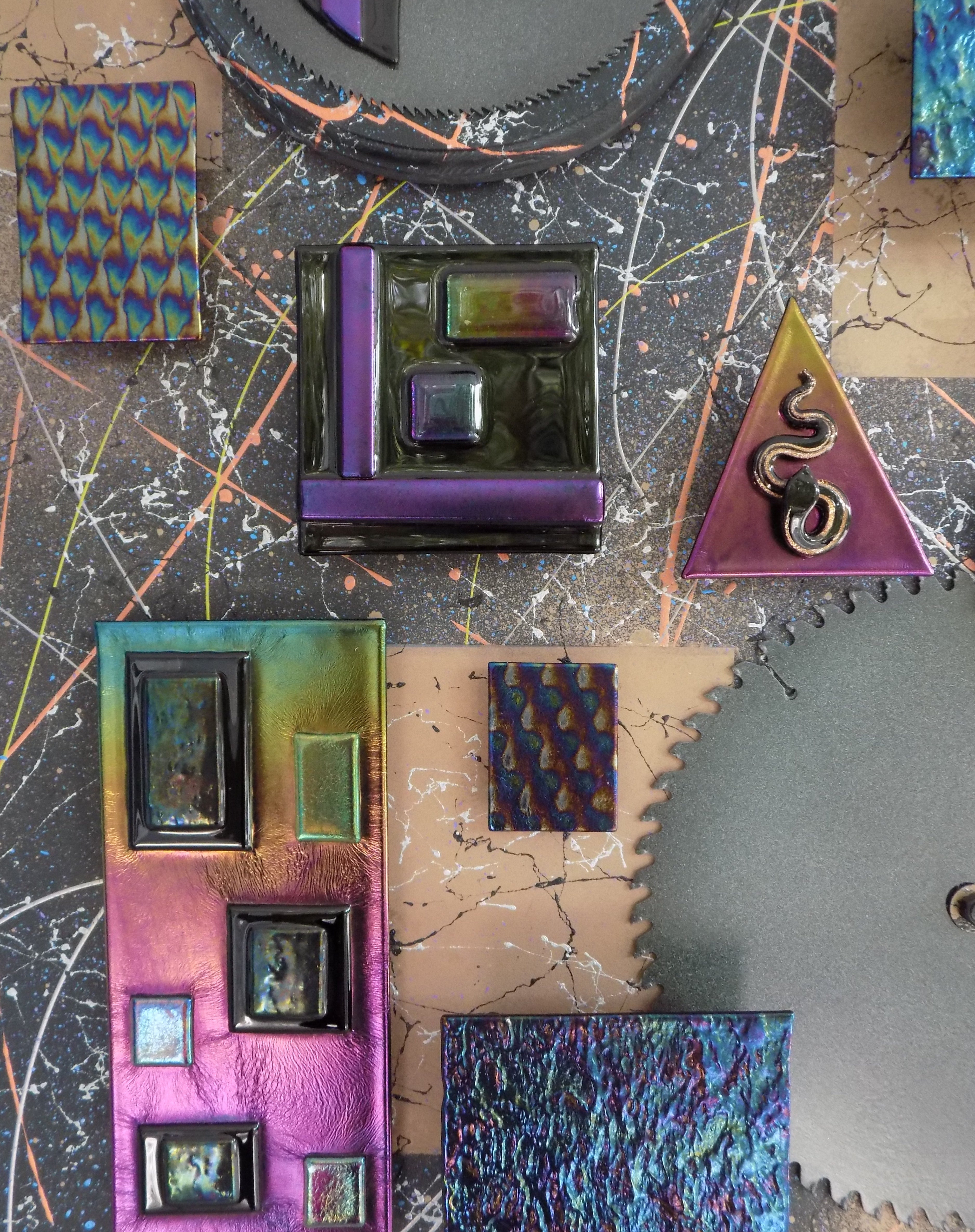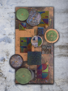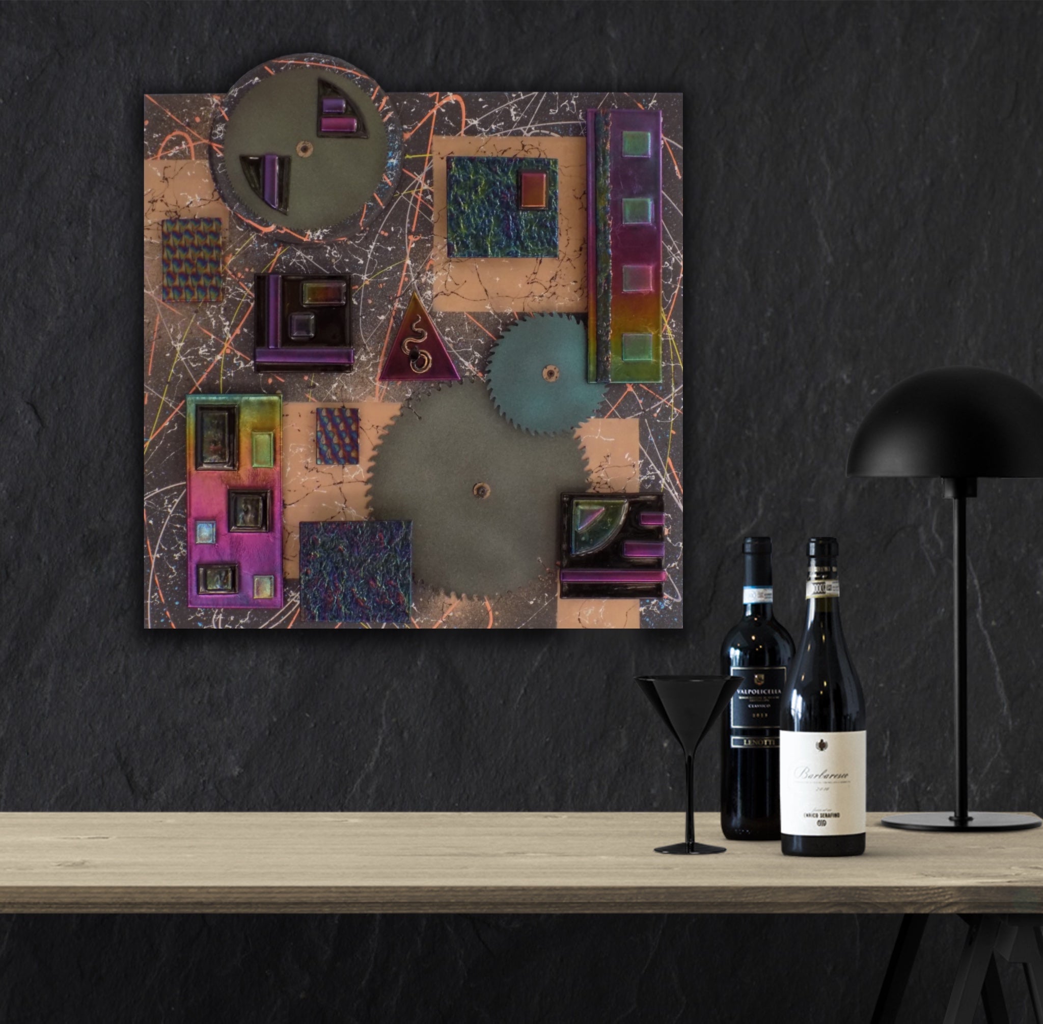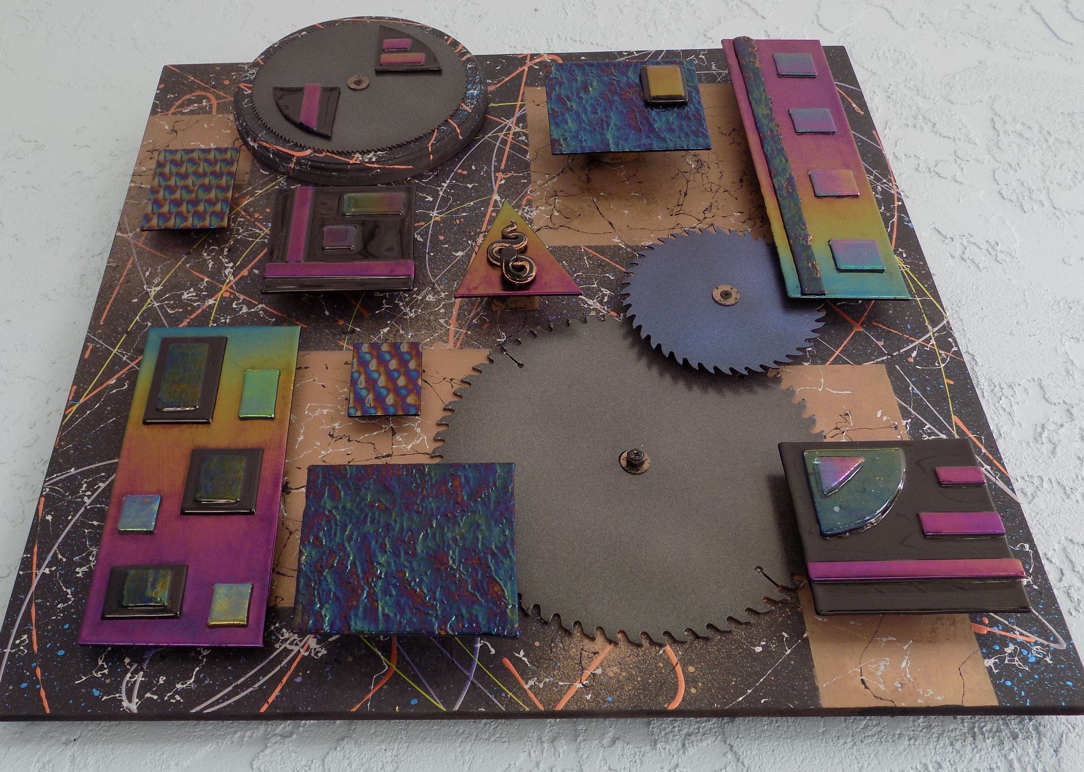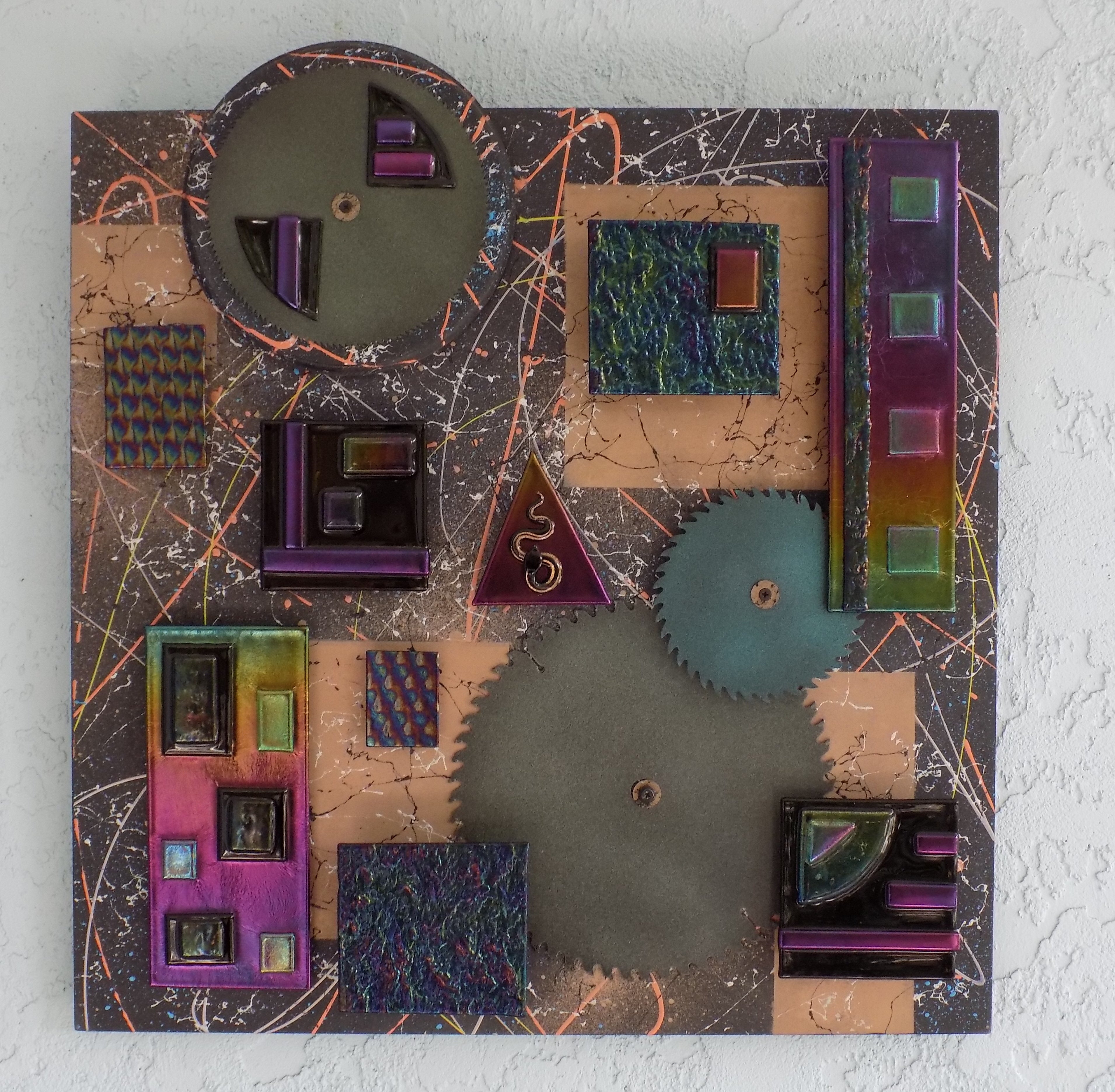 "Machine Head 2" - 24" x 26" Original mixed media fused glass and saw blades on an abstract painted wood panel by artist Helen Geremia.