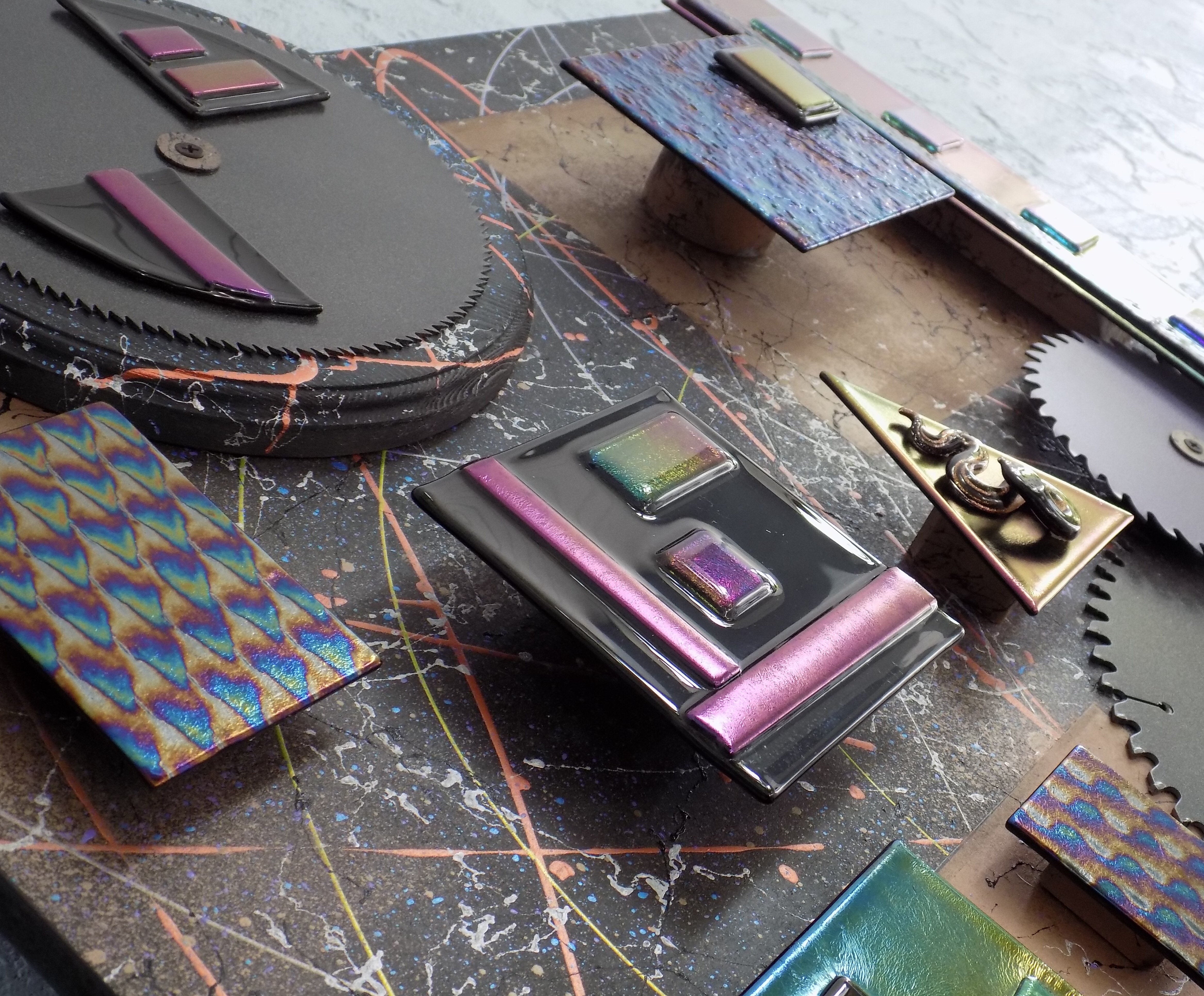 Machinehead I and II take Bush to a new level. Mixed media with wood, metal, and metallic glass elements, both fused and blown, come together on a color shifting background. In the past several years there have been a lot of changes to the glass industry resulting in limitations of what can be produced here in the US, some of the glass used in these pieces is no longer available making them truly one of a kind pieces of art.