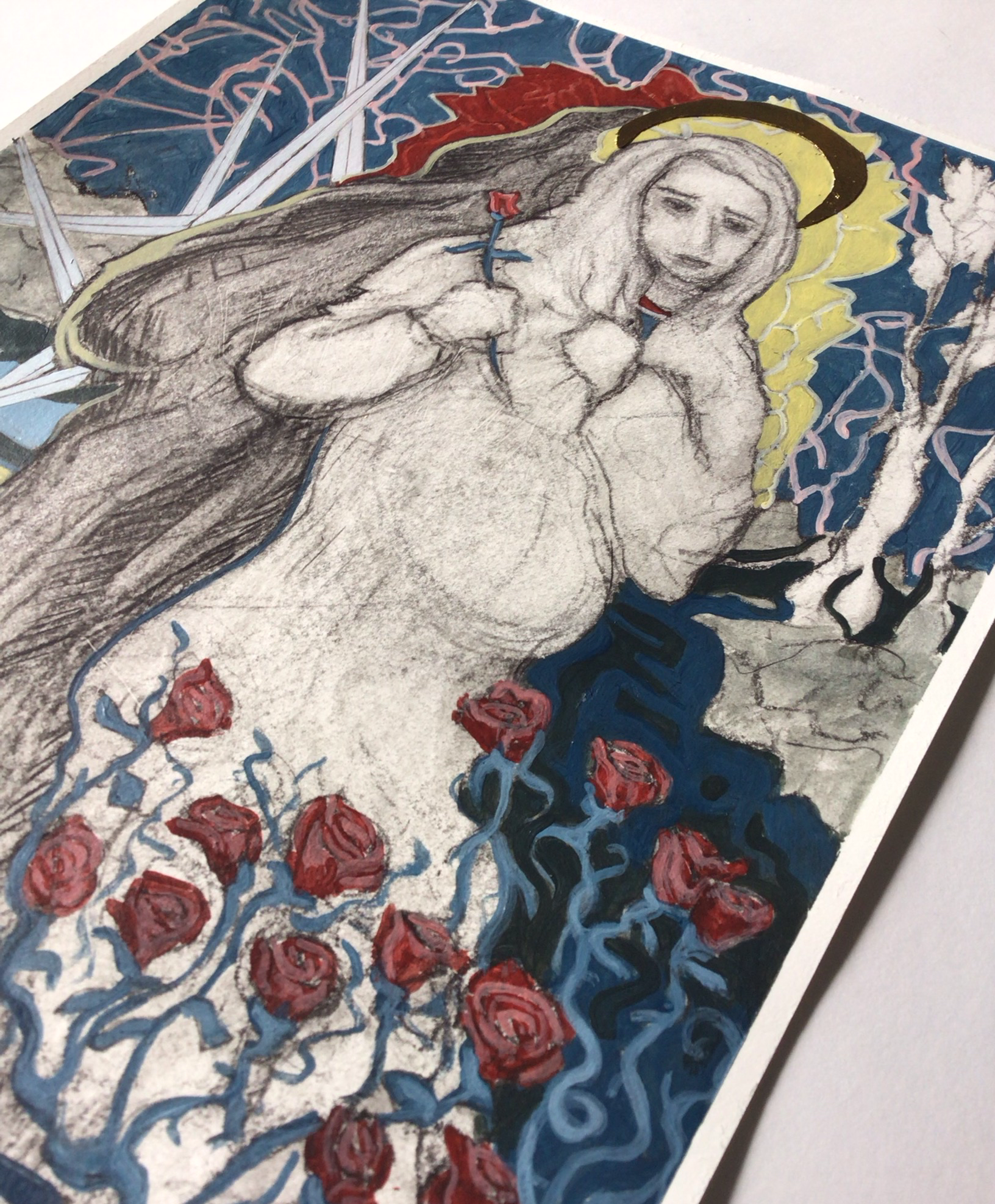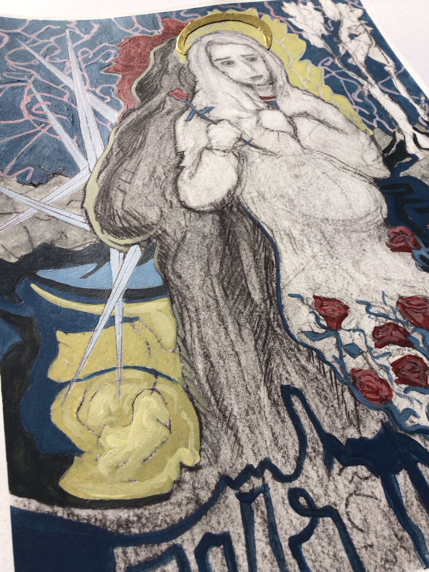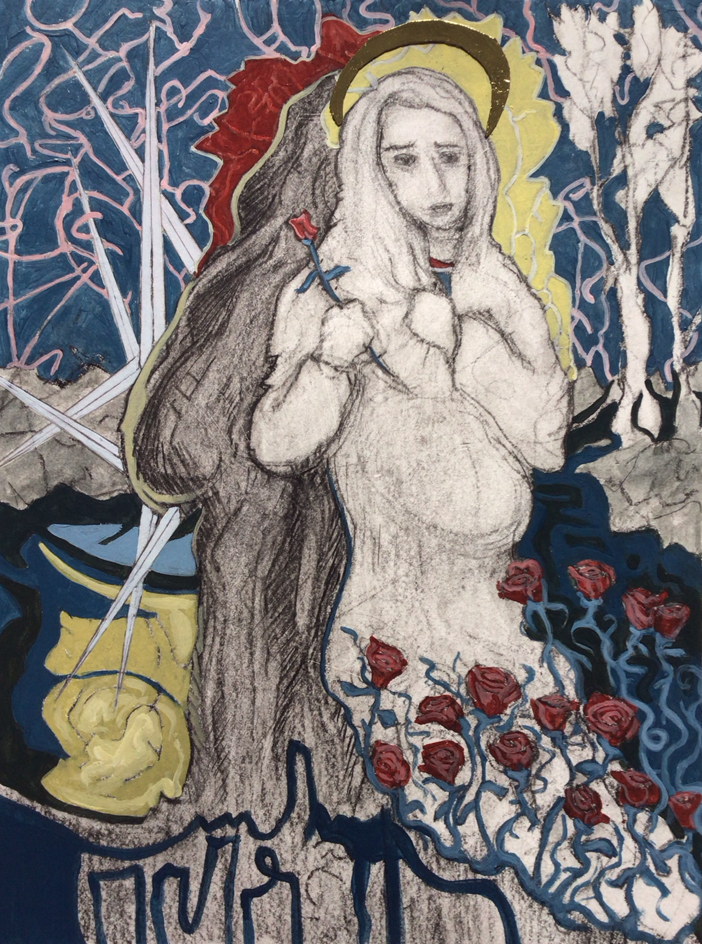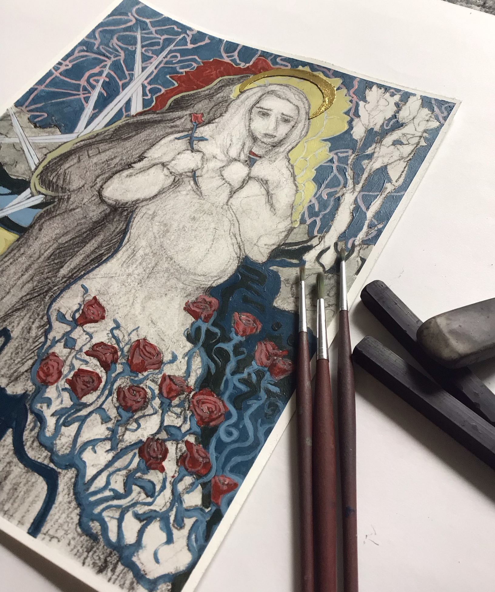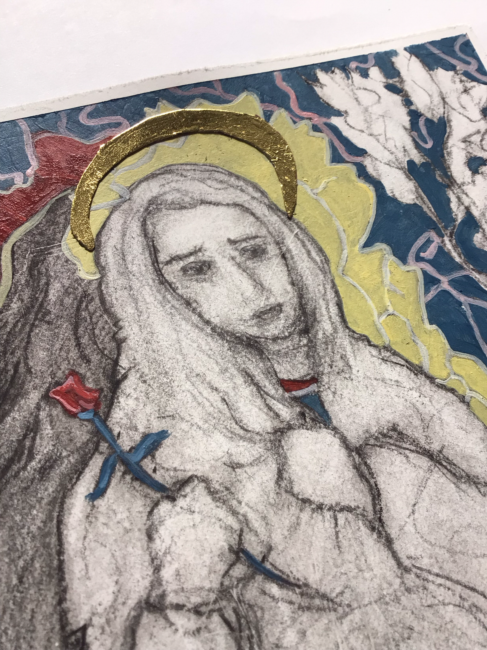 "The Virgin Mother and the Bearer of Seven Swords" - 9" x 12" Original charcoal and acrylic on paper. By artist Chris Geremia.  *** Sold unframed. Frame is not included ***