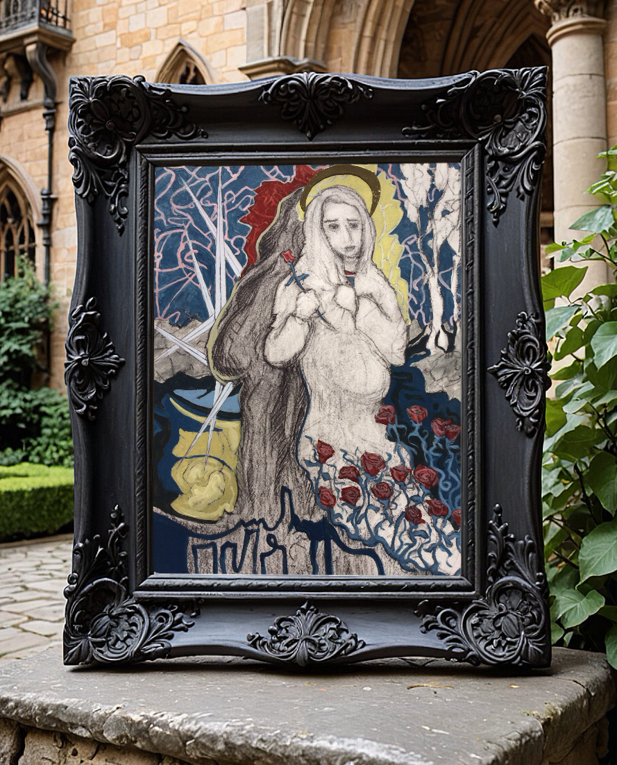In the quiet depths of twilight, The Virgin Mother emerges, heavy with promise and full of grace.  Her eyes are set forward, carrying the gaze of one who sees beyond the path beneath her feet.  Her steps are gentle, yet they cleave open the world, for each motion carries a weight that creation itself leans upon…. See the rest of the narrative at: https://pictorislore.com/
