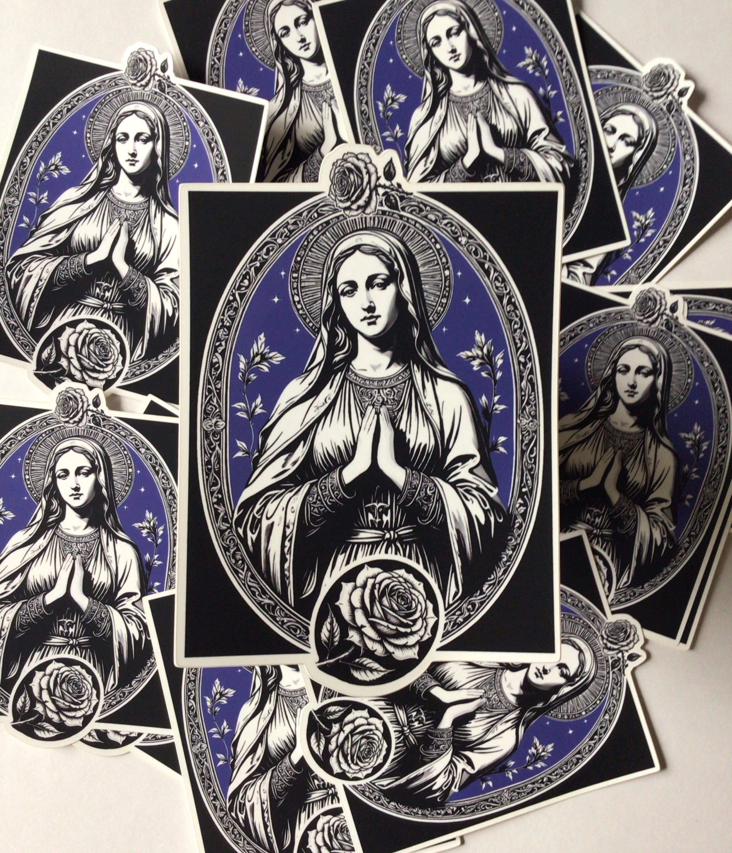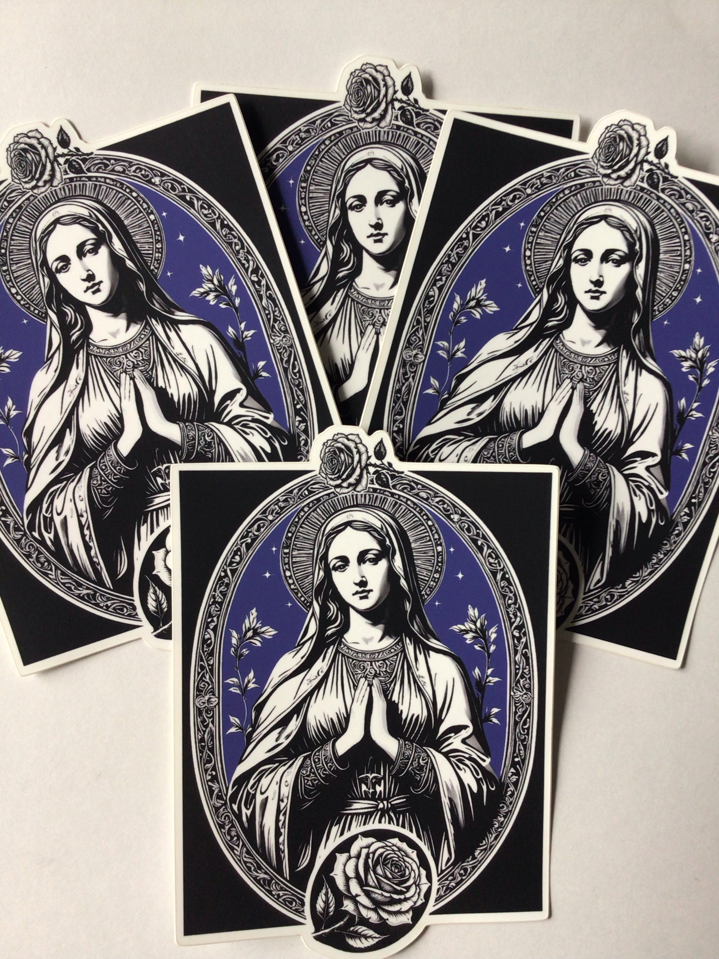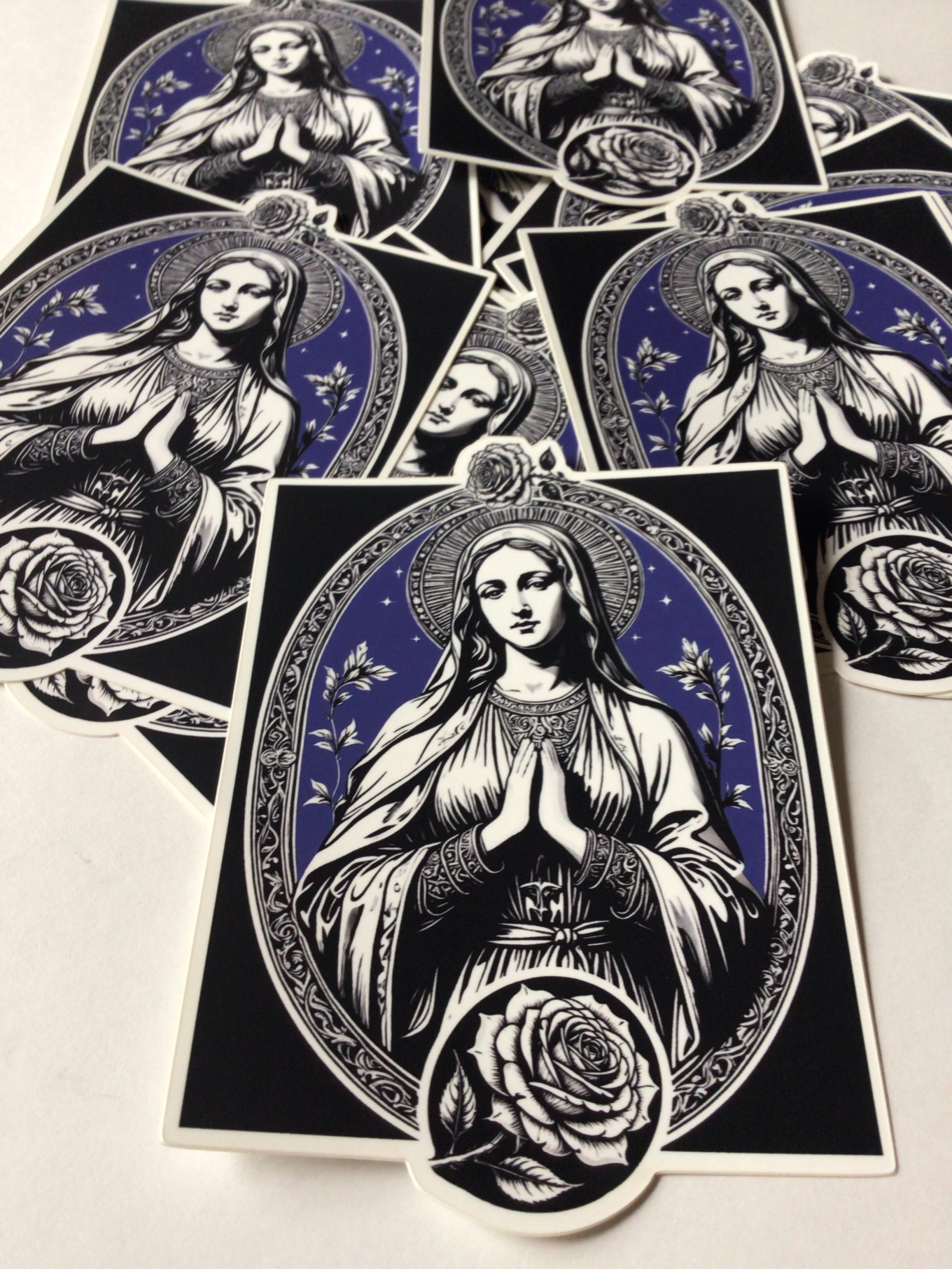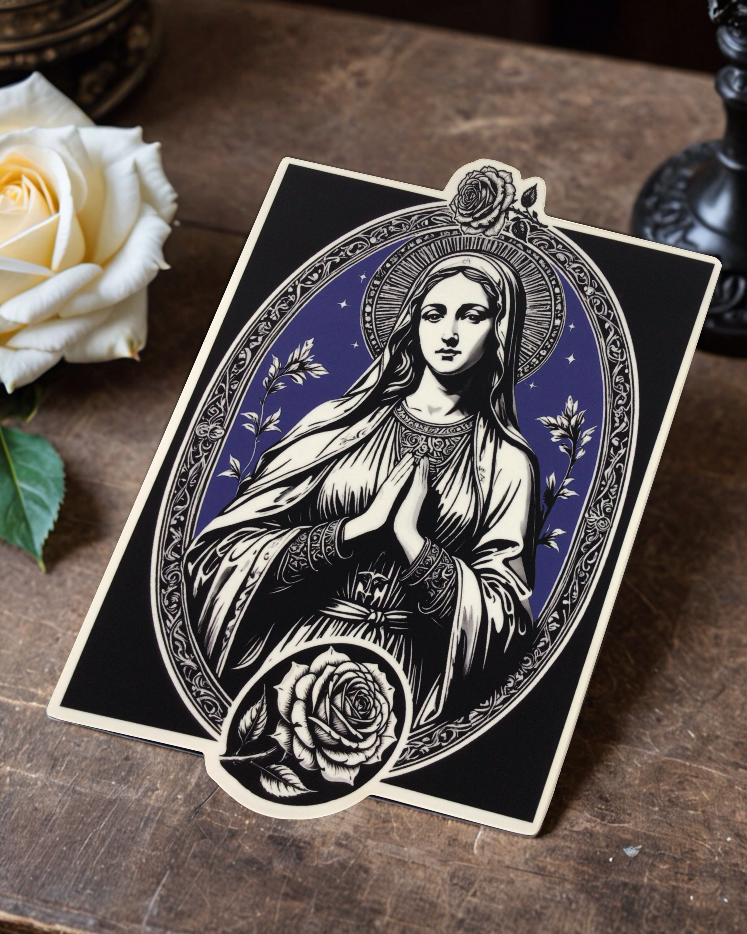 This beautiful Gothic style line drawing of the Blessed Virgin Mary is set against a serene evening blue background, symbolizing the heavenly ascent and divine grace that envelops her. In Catholic tradition, blue is often associated with the heavens and the Virgin Mary’s royal and celestial nature, representing her close connection to the divine and her role as Queen of Heaven. The two roses—one at her feet and one atop her head—are powerful symbols of the gifts offered on earth being recognized and elevated in heaven. These roses remind us of Mary’s role in interceding for the faithful, as well as the importance of devotion, humility, and grace in our earthly journey.